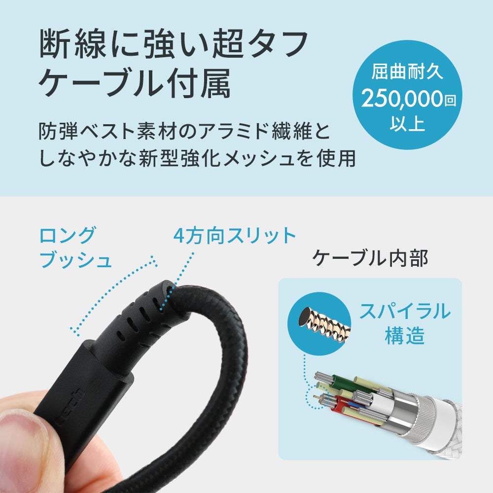 断線の原因につながるコネクターの根元部分を強化することで25万回以上の折り曲げに耐える強化構造を実現。ケーブル内部に、ひっぱり強度が高く、防弾チョッキなどに使用されるアラミド繊維を使用しています。