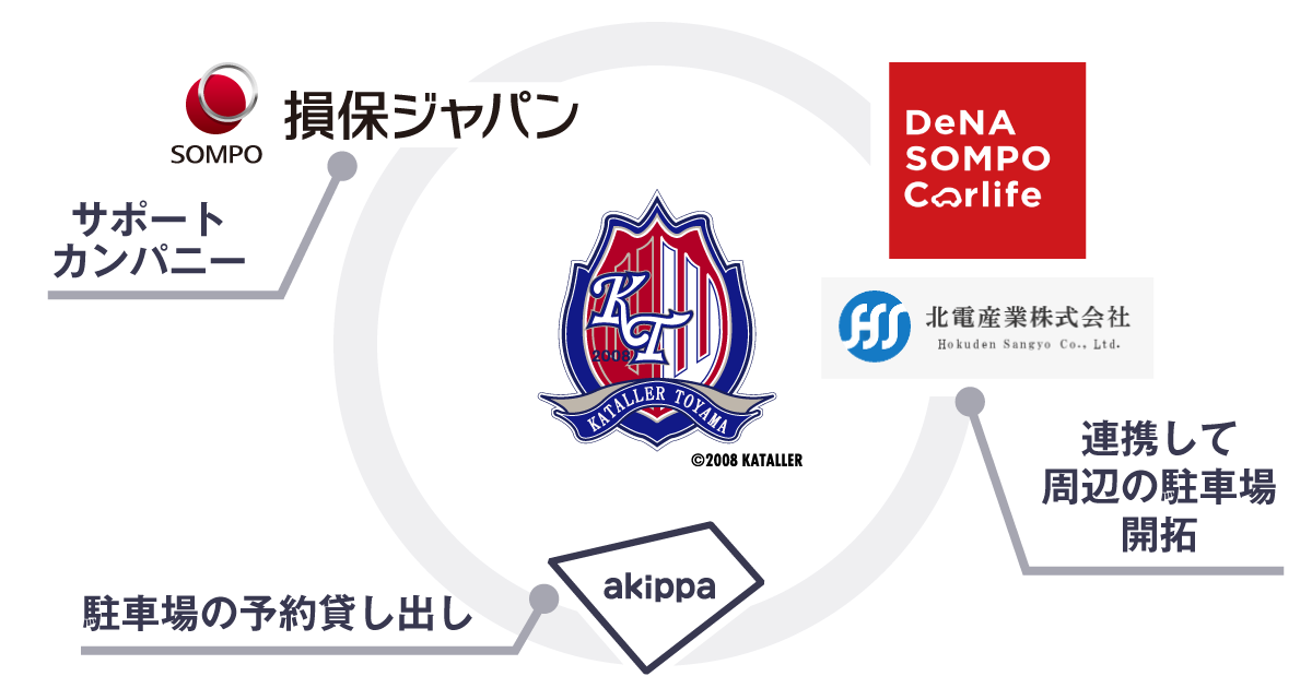 カターレ富山・akippa・SOMPOグループでakippaの代理店でもある株式会社DeNA SOMPO Carlife・損保ジャパン・北電産業5社で連携のうえ、近隣地元企業の駐車場や空きスペースを活用し、akippaで事前予約可能な駐車場として拡大していくことで、交通の分散化を目指します。