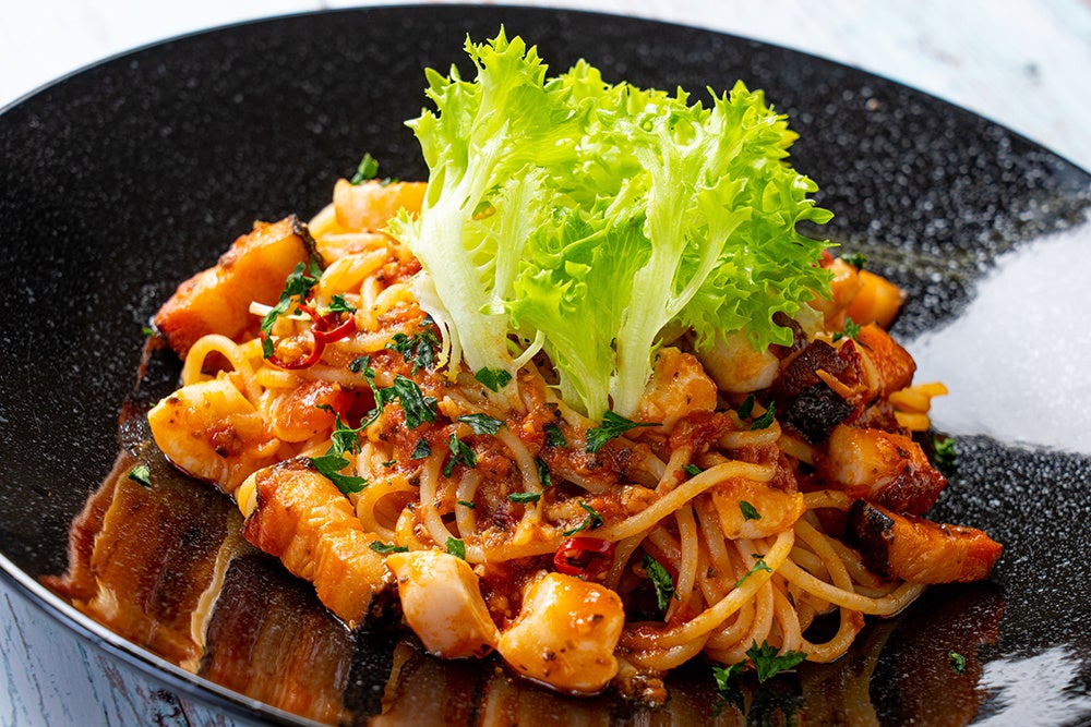 【夏に食べたい期間限定メニュー】トマトの旨みと隠し味のピリ辛のスパイスが口の中で踊る!店内製麺にこだわる北海道生パスタ専門店「麦と卵」で「北海道産タコと「農家のベーコン」のピリ辛トマトソース」を販売!