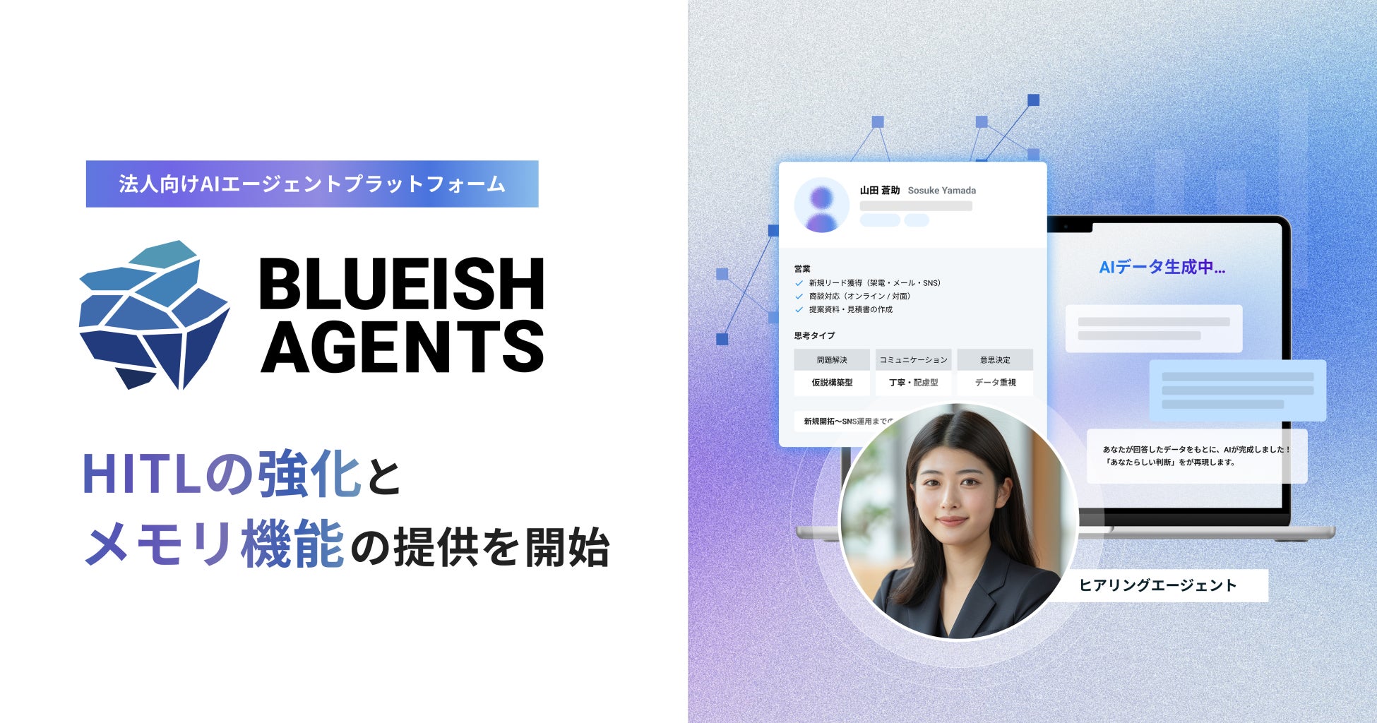株式会社BLUEISH(東京都港区、代表取締役 為藤アキラ)は、法人向けAIエージェントプラットフォーム『BLUEISH Agents』において、HITL(Human-in-the-Loop)機能の強化とメモリ機能の正式提供を開始しました。