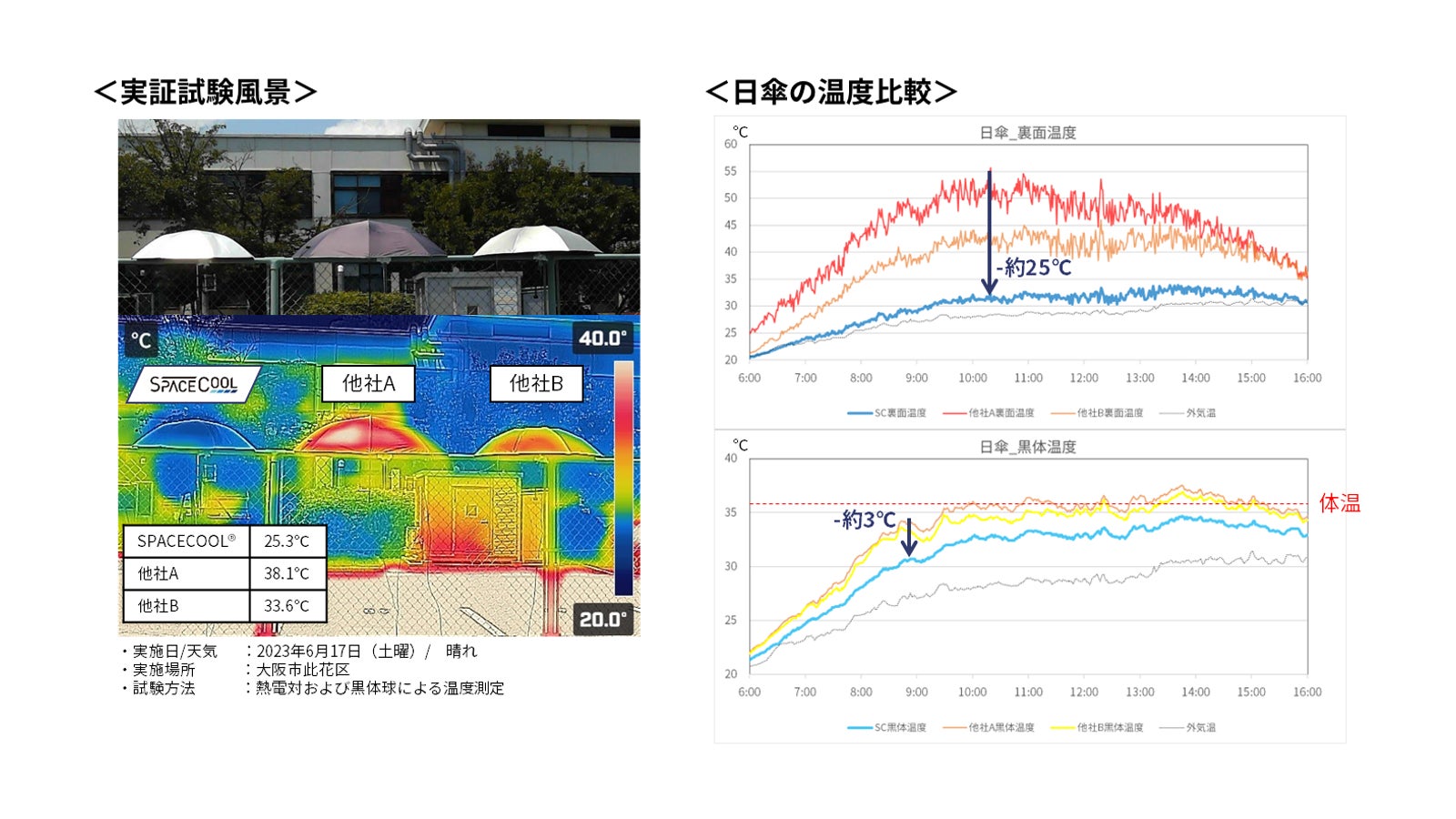 2023年6月に他社製の日傘と比較検証を実施したところ、生地の裏面温度は最大で約25℃、体感温度においては約3℃の温度低下を観測できました。