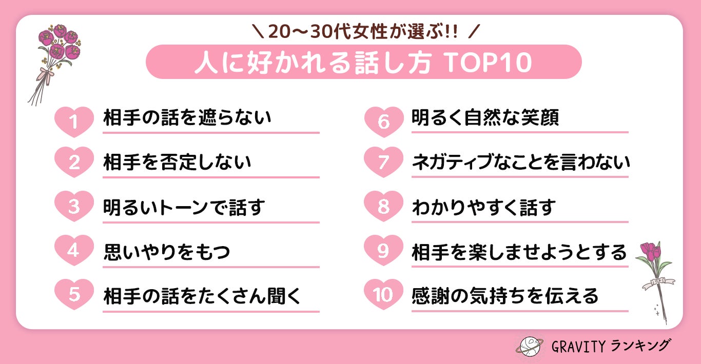 【GRAVITYランキング】20代〜30代女性が選ぶ!!「人に好かれる話し方TOP10」