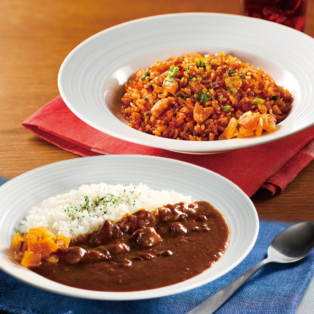 この度発売する「ビーフカレー」は、牛肉やオニオン、マッシュルームなどの厳選した素材をじっくりと煮込んだ、中辛に仕上げた欧風カレーです。濃厚でコクのある味わいをお楽しみいただけます。甘辛いコチュジャンで韓国風に仕立てた「タッカルビ炒飯」は、ピリッと旨辛な味わいがクセになるおいしさです。