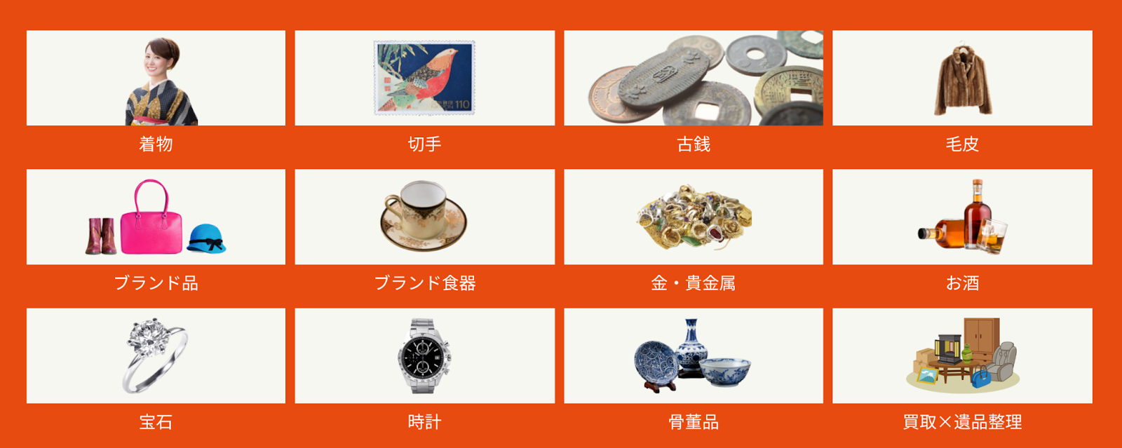 | ・ブランド品 ・ブランド食器 ・金・貴金属 ・着物 ・毛皮 ・宝石 ・時計 ・切手 ・古銭 ・骨董品 ・お酒 ・家具家電 ・おもちゃ ・楽器 ・カメラ ・スポーツ用品 |