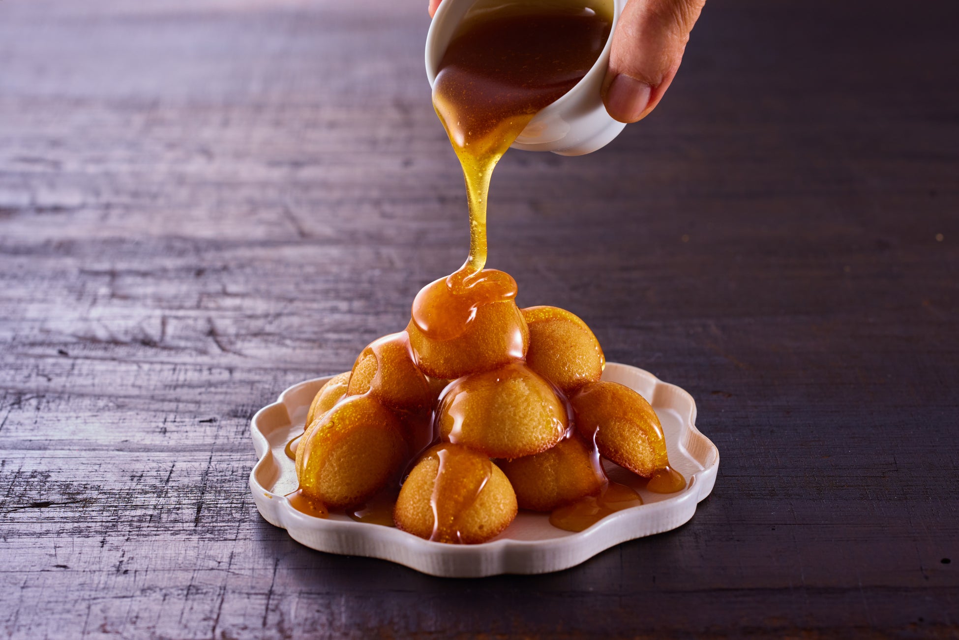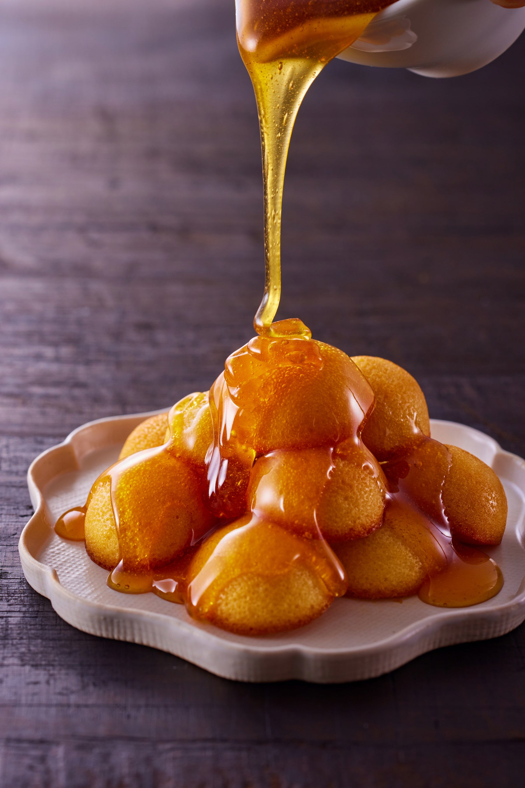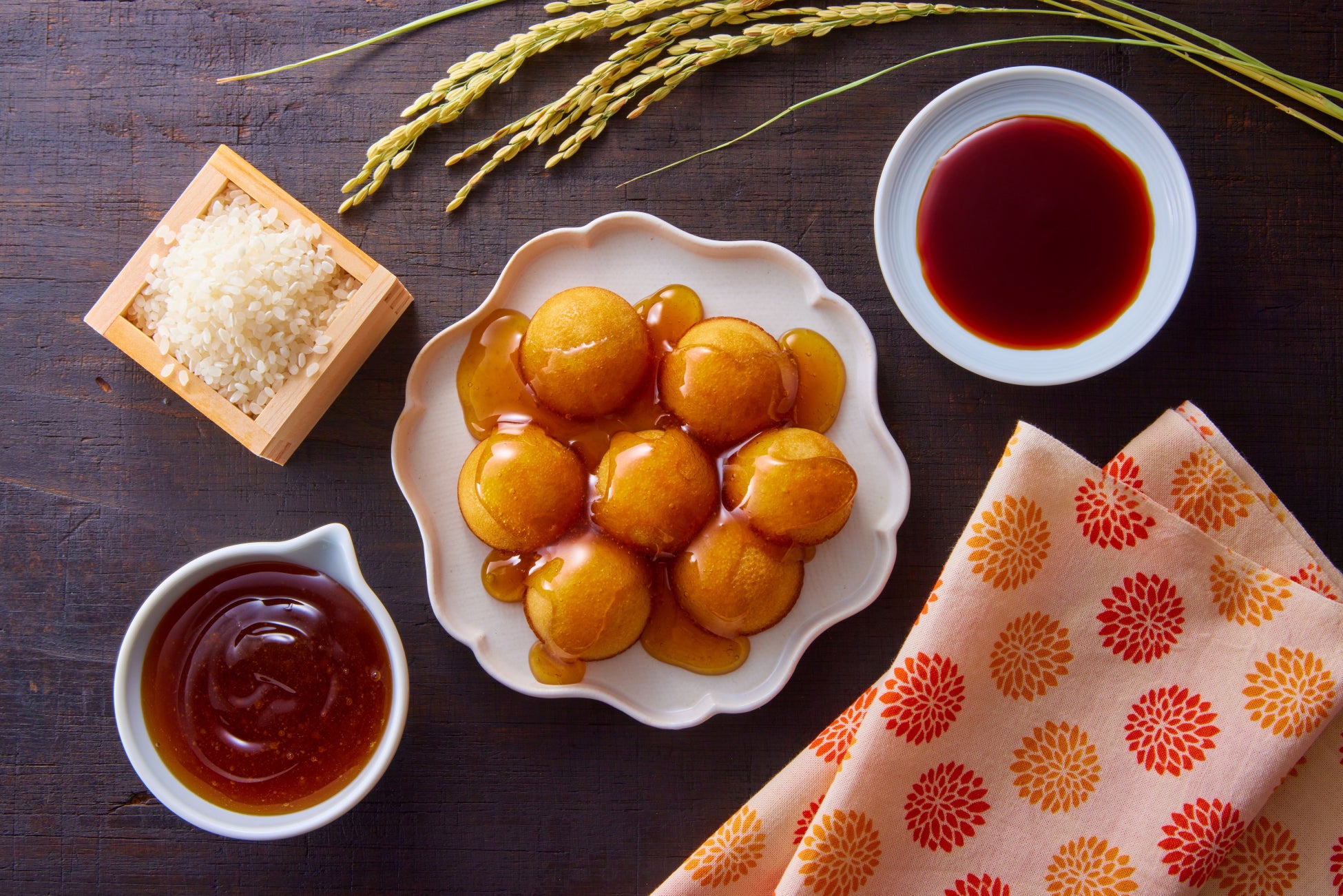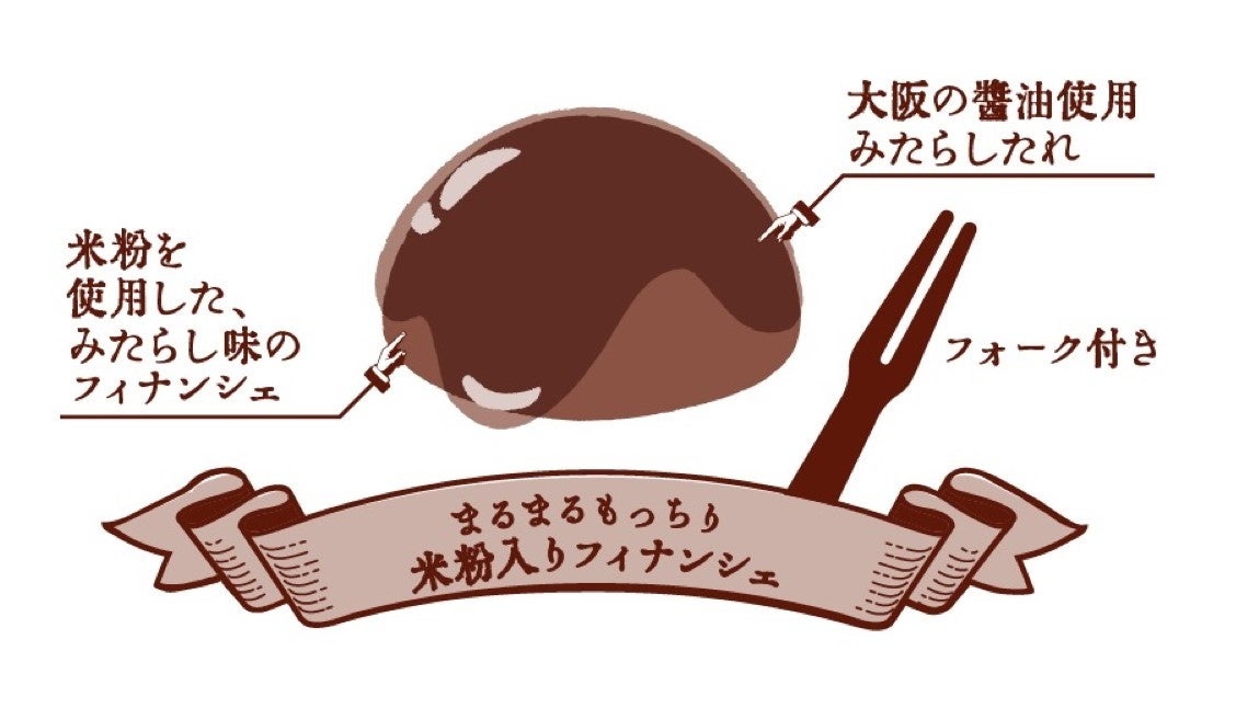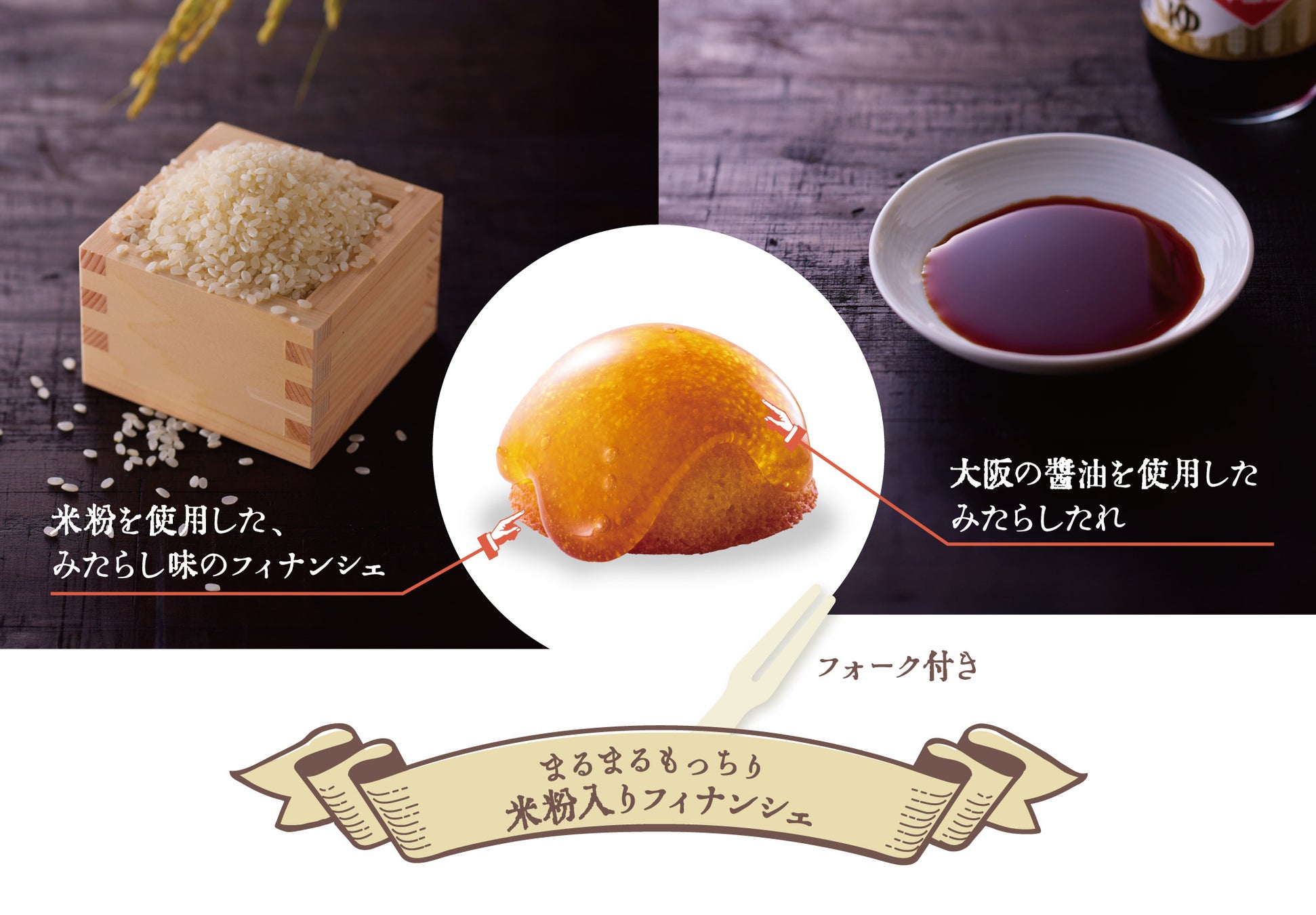 丸形の「みたらし団子」に見立てたフィナンシェに、大阪の醤油を使用したみたらしのタレをかけました。フィナンシェには、契約農家から仕入れたコシヒカリを美十の自社工場にて自社精米・製粉した米粉を使用。みたらし味でもっちりとした食感が特長です。