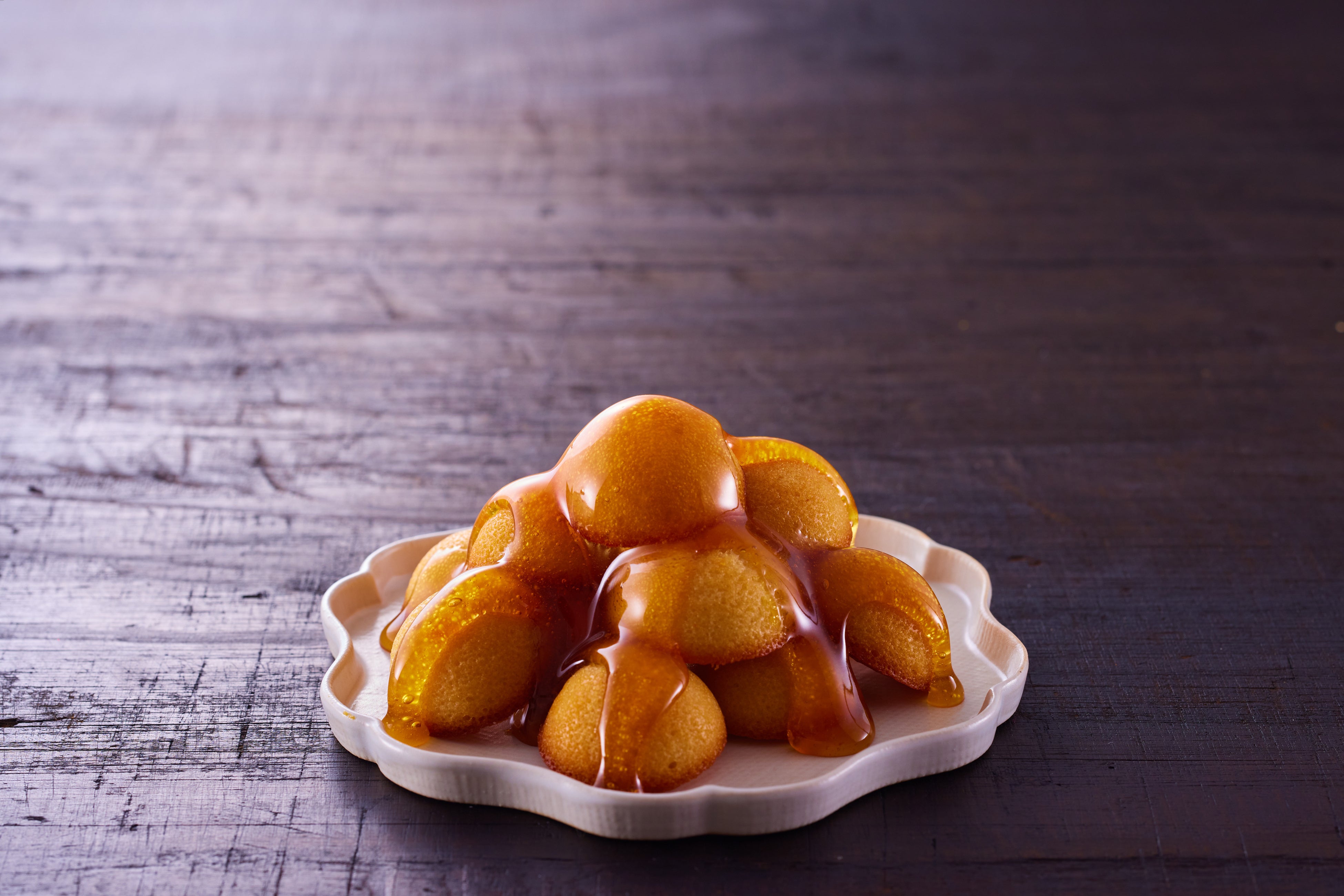 醤油感のある濃いめの味付けのみたらしタレは、醤油・昆布だしを使用し、本格的なみたらし味を追求しました。みたらし団子を再現するため、こだわりのタレを丸形のフィナンシェにかけた、見た目も楽しめる一品です。 <フォーク付き>