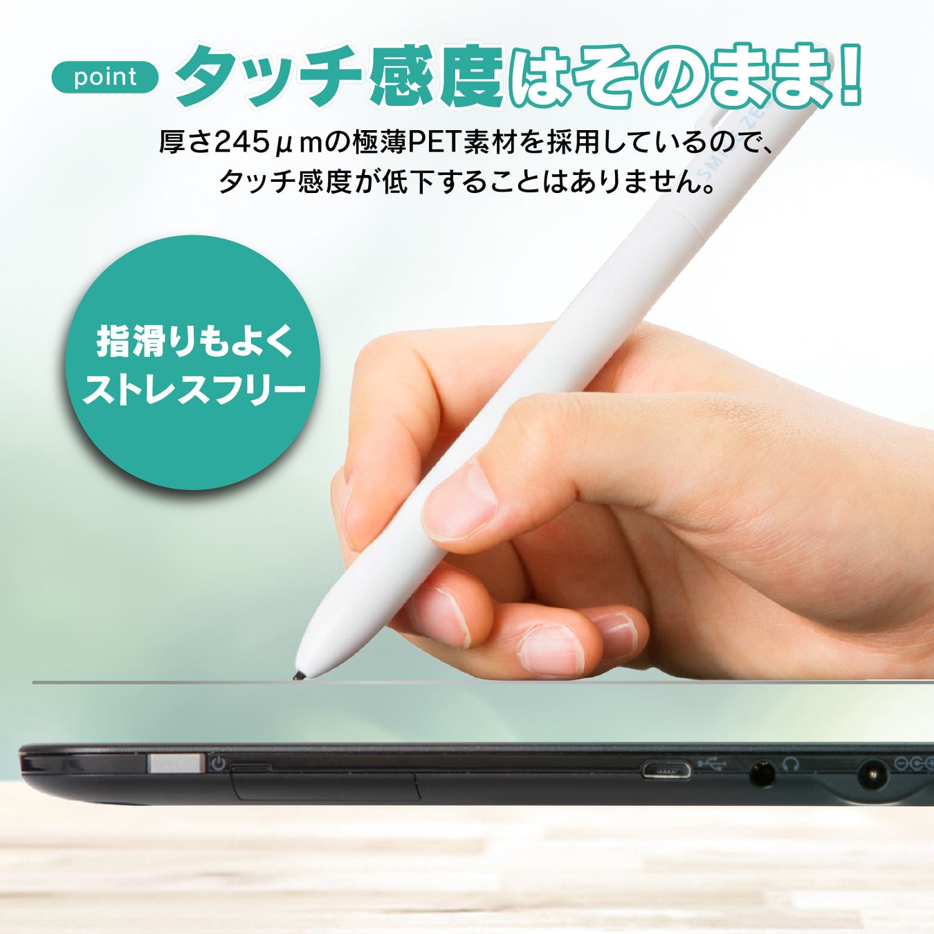 厚さ245μmの極薄PET素材を採用しているので、タッチ感度が低下することはありません。