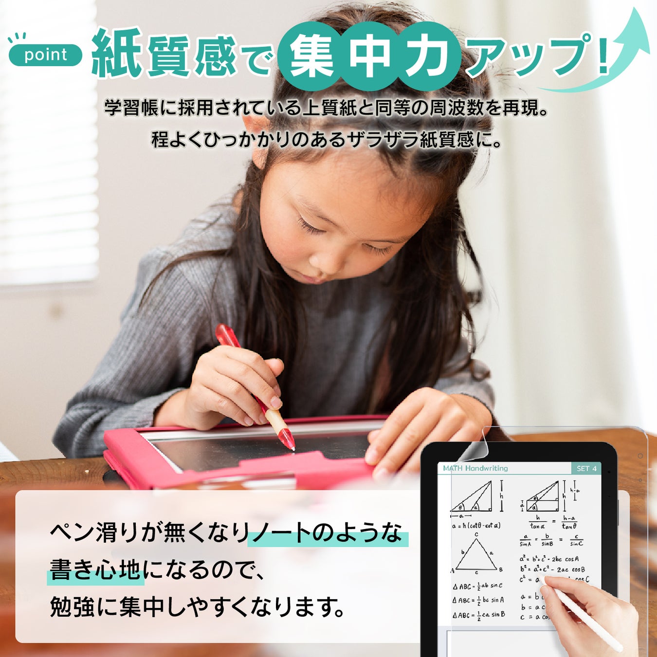 ペン滑りが無くなりノートのような書き心地になるので、勉強に集中しやすくなります。