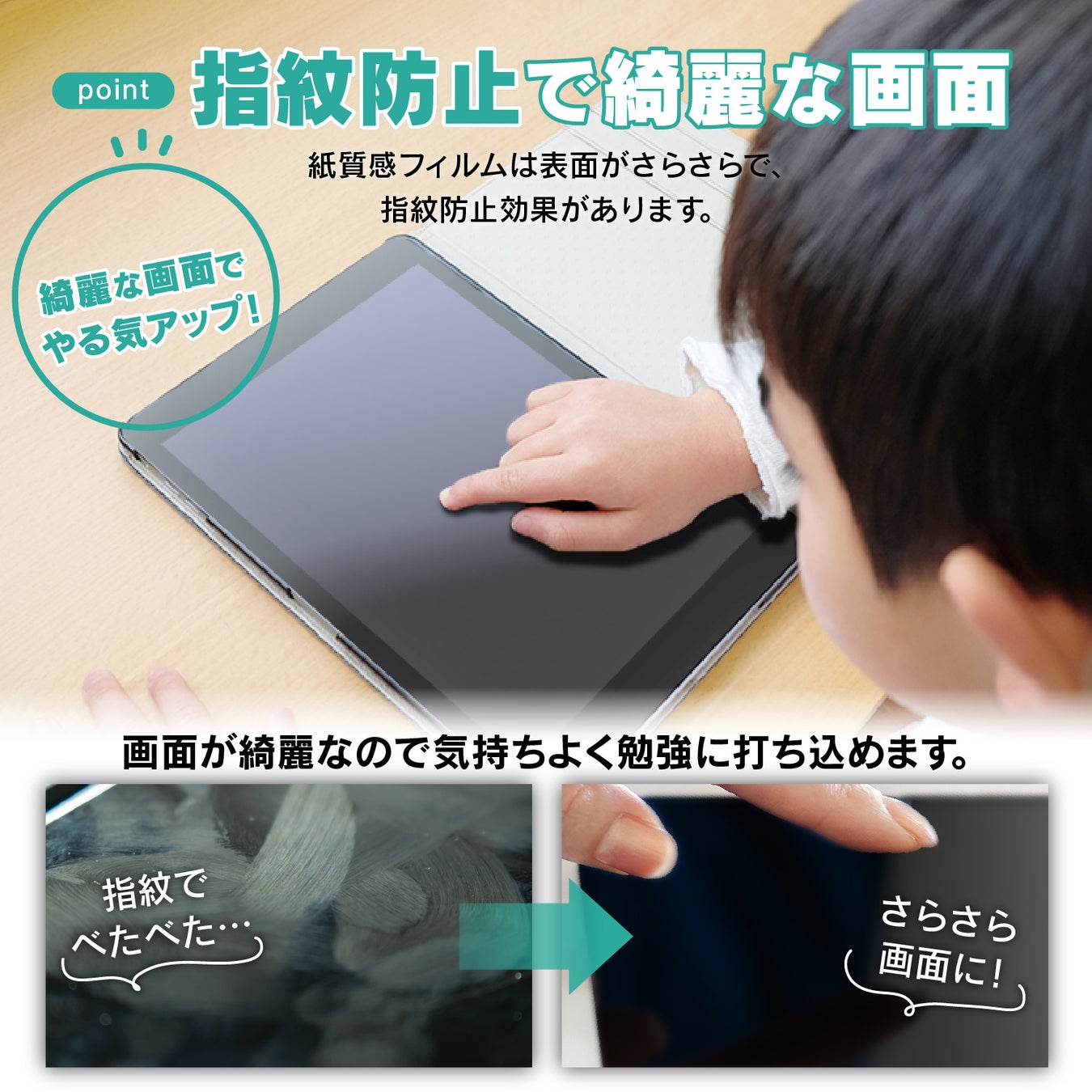 紙質感フィルムは表面がさらさらで、指紋防止効果があります。画面がベタベタ指紋で汚くなりません。