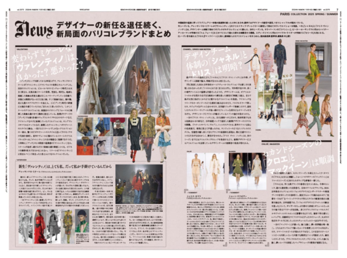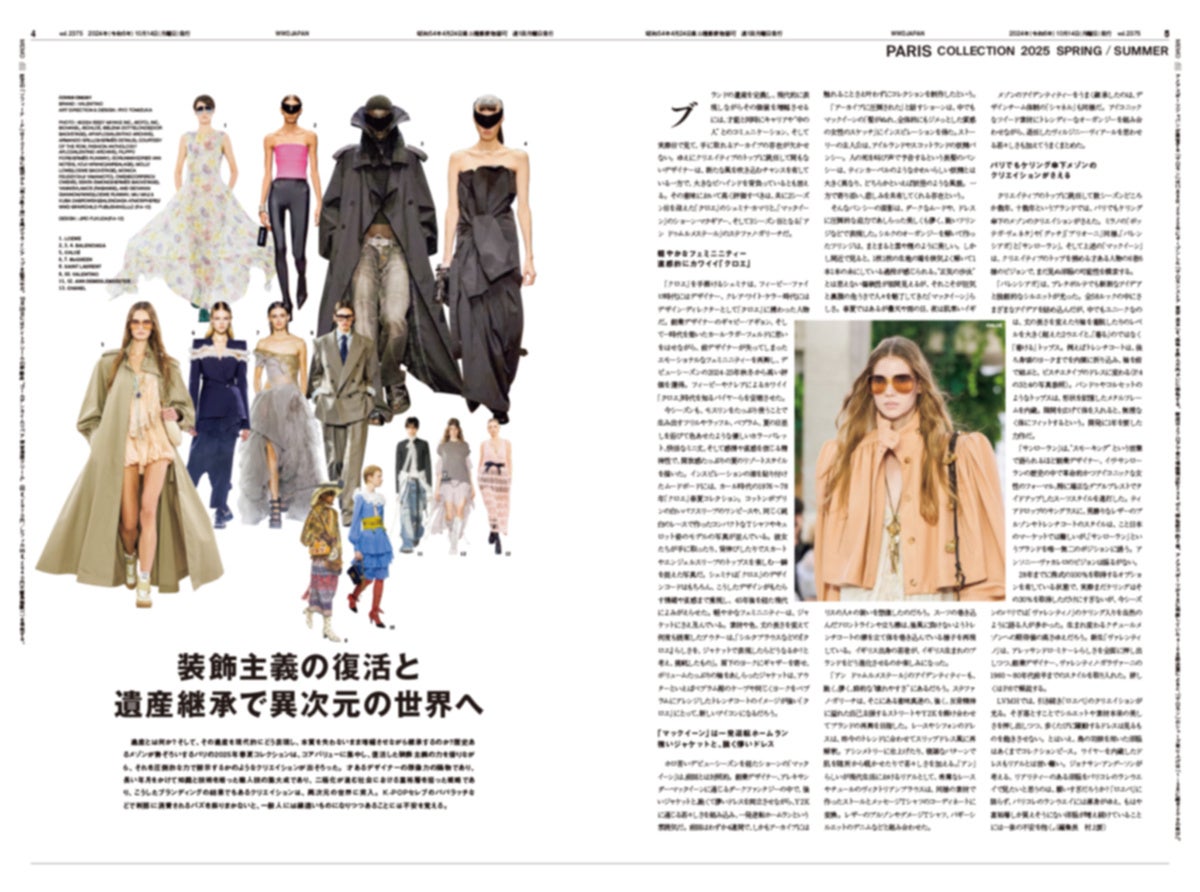 2024年10月14日発売の「WWDJAPAN」は、2025年春夏のパリ・コレクションを特集します。「WWDJAPAN」のパリコレ取材チームは8日間にわたり、毎日15以上のブランドを取材。その中で見えてきた傾向、皆さんが知っておくべき新デザイナーのクリエイション、そして彼らの思いをまとめたインタビューなどをお届けします。