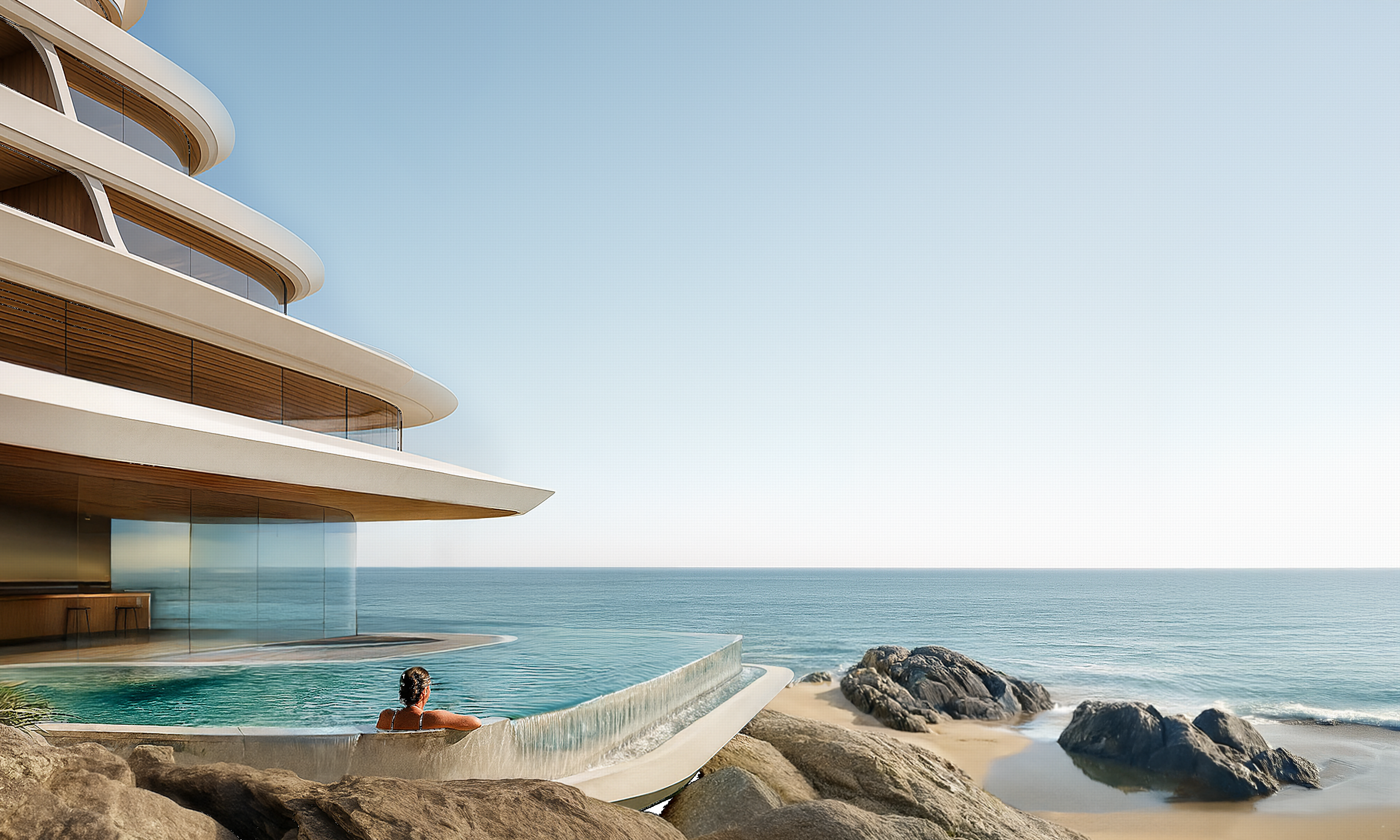 「敷地が持つ卓越した地形から着想を得た今回のデザインは、自然界に見られる地形形成の探求を通じて構成や素材にアプローチする、ZHAの継続的な研究の延長線上にあります。ホテルの段状キャノピーは、独特な海岸線の地質から熱帯雨林の豊かな植生へと柔らかくつながり、海の眺望を遮ることなく、周囲の環境との深い一体感をもたらします。同時に、プライバシーを確保することで利用者体験をより豊かにし、この地域に広がる多様な自然生態系を巡る“発見の旅”を描き出します。」