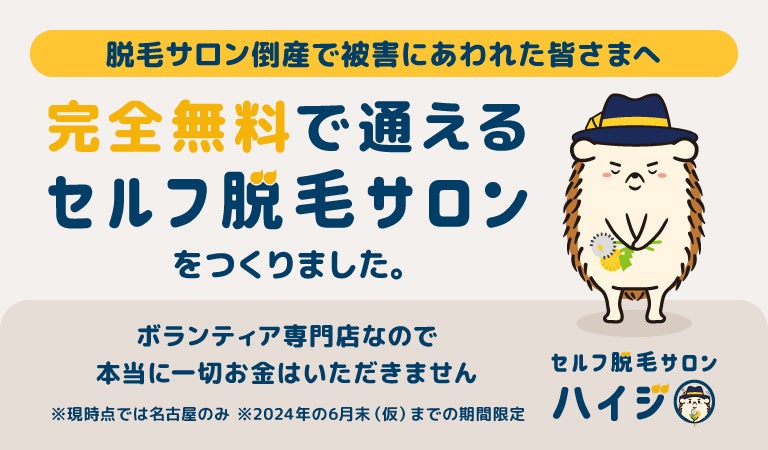 全国で70店舗ある完全無人の「セルフ脱毛サロンハイジ」を運営する株式会社ハイジ(本社:東京都中央区日本橋・代表取締役:斎藤 一誠)は2024年1月1日から、脱毛サロン倒産により被害にあわれてしまった方々に向け、「完全無料の仮設店舗」を愛知県名古屋市限定で「(仮設)Gカラー女性専用名古屋駅前店」として、2024年6月末まで運営することを決定いたしました。