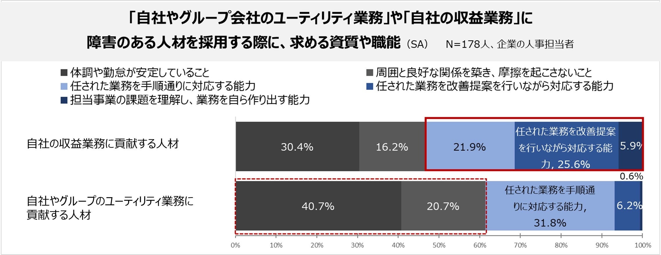 「自社やグループ会社のユーティリティ業務」や「自社の収益業務」に貢献する障害のある人材を採用する際に、求める資質や職能: