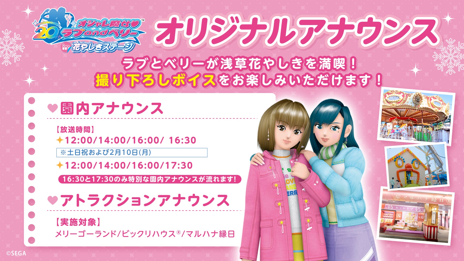 本イベントでは、冬のオシャレコーデで花やしきへ遊びに来たラブとベリーをイメージしてさまざまな施策をご用意しております。オリジナルデザインのグッズの販売やコラボフード、スタンプラリー、アナウンスなどを展開します。また、ゲームの中に入ったような世界観が楽しめるように「パノラマ時間旅行」がコラボアトラクション仕様となってお楽しみいただけます。