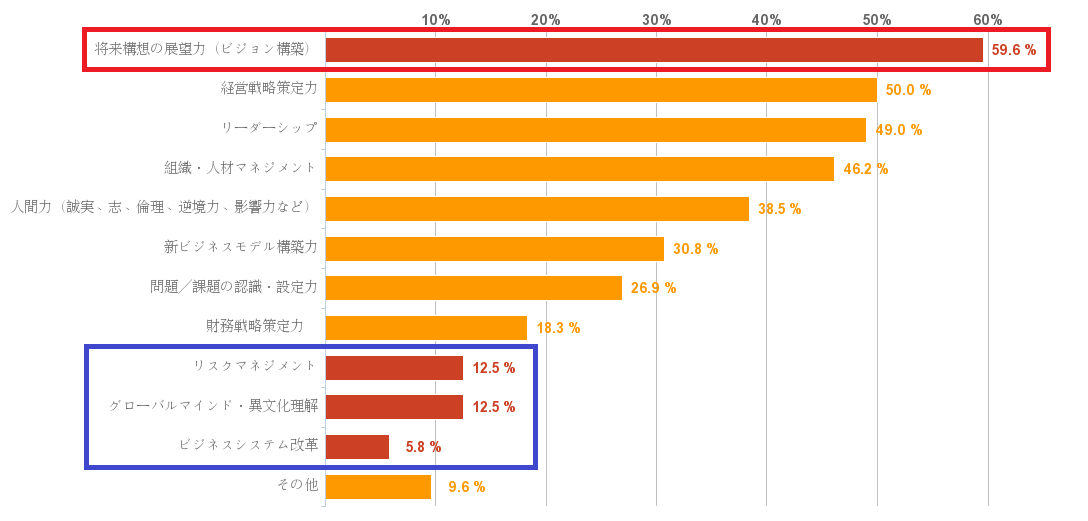 企業が実施・検討している強化テーマは「ビジョン構築」が最も多く、「経営戦略策定力」や「リーダーシップ」が続きます。次世代経営人材には、不確実性が高い時代において企業の未来を想像し、先導する力が求められるといえるでしょう。比べて、「リスクマネジメント」「グローバルマインド・異文化理解」「ビジネスシステム改革」などは実施・検討割合が低い結果となりました。