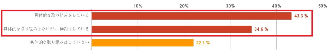 その一方で、「次世代経営人材の育成を目的とした取り組みの実施状況をお聞かせください」という設問では、43.3%が「具体的な取り組みをしている」と答え、34.6%が「具体的な取り組みはないが、検討はしている」と答えました。いずれの企業も喫緊の課題として取り組んでいる様子が伺えます。