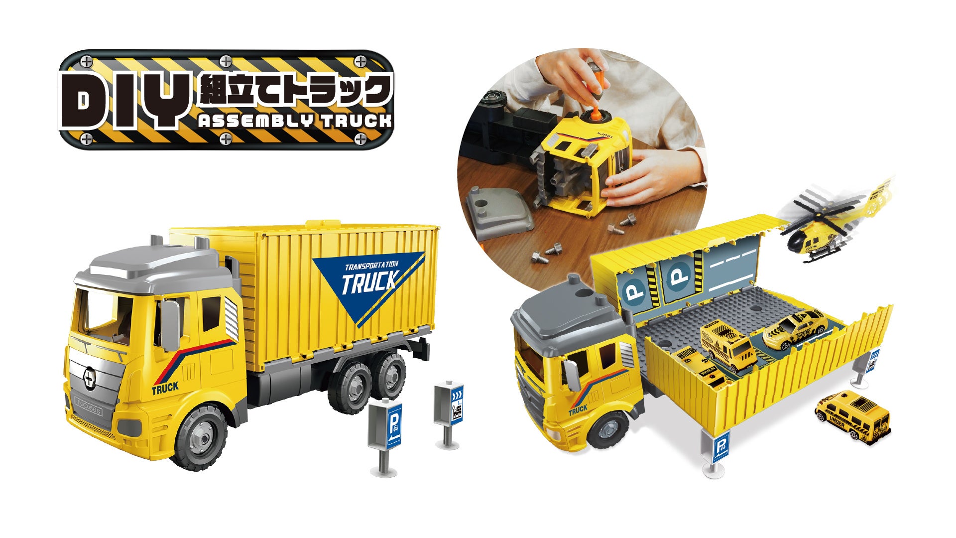 特徴:自分で組立てるトラックが登場!DIYだから遊びながら知育にもなるよ。コンテナがパカっと展開するから、付属の車両を格納できるのも楽しい!組立てたトラックは、フリクション走行可能でビューンと動くよ!