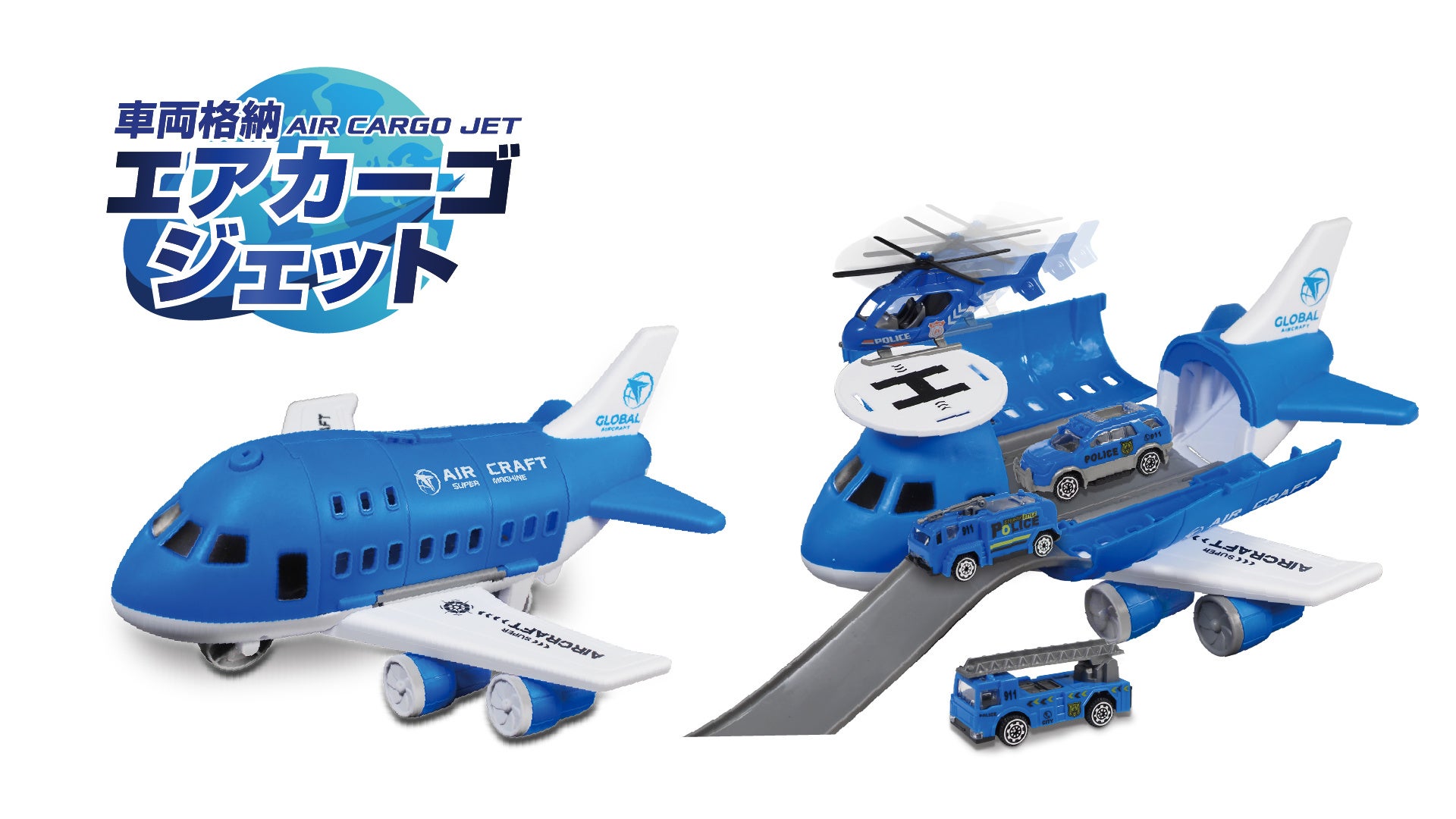 特徴:BIGサイズのジェット機!緊急車両を内部に収納して運ぼう♪ハッチが開閉する!本体にヘリポートを設置!車両を機内から出動!機体をコロコロと手転がしで発進させよう。