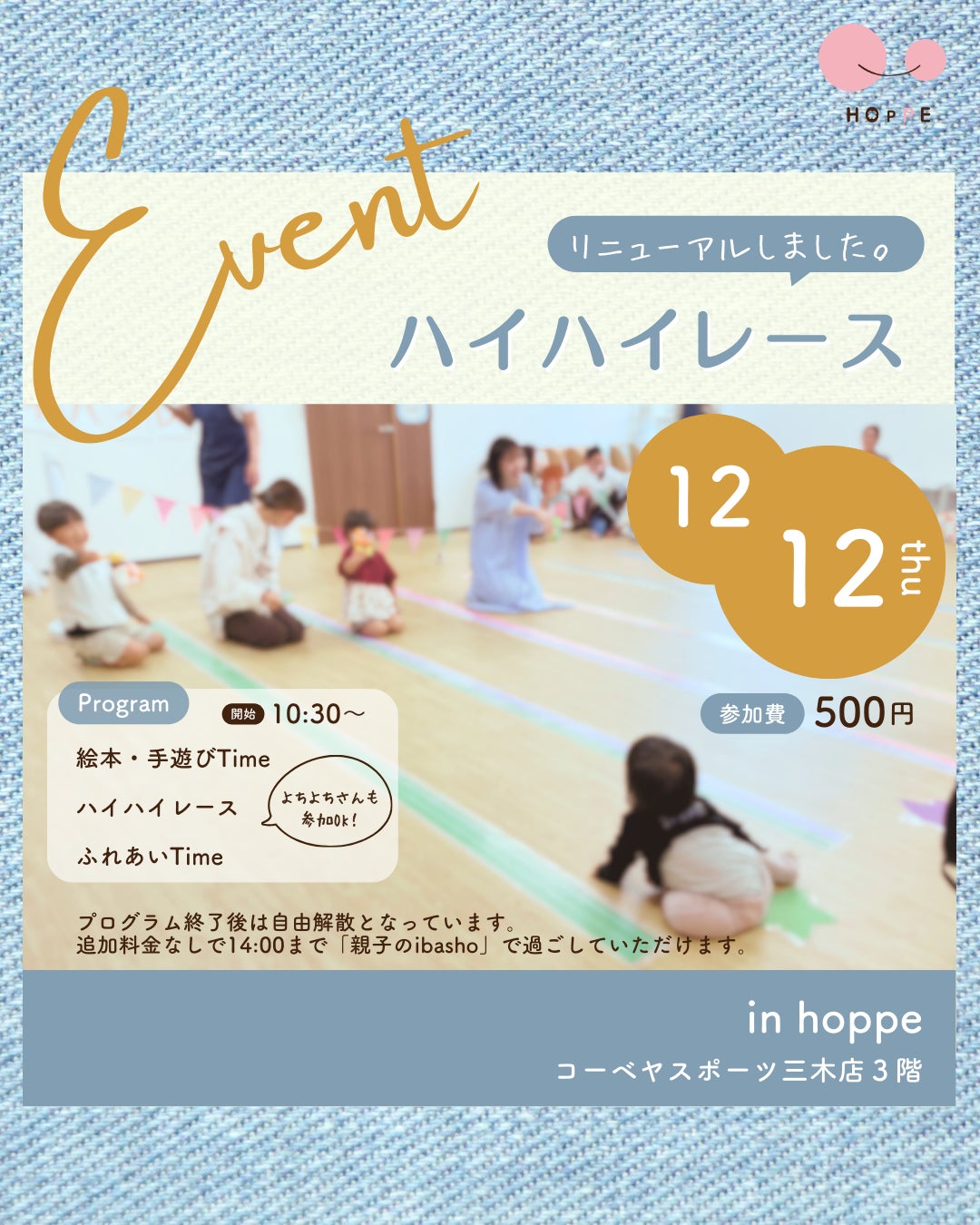 開催場所:hoppe/コーベヤスポーツ三木店3階(住所:兵庫県三木市末広2丁目4-8※駐車場有)神戸電鉄粟生線「三木駅」から西へ徒歩3分