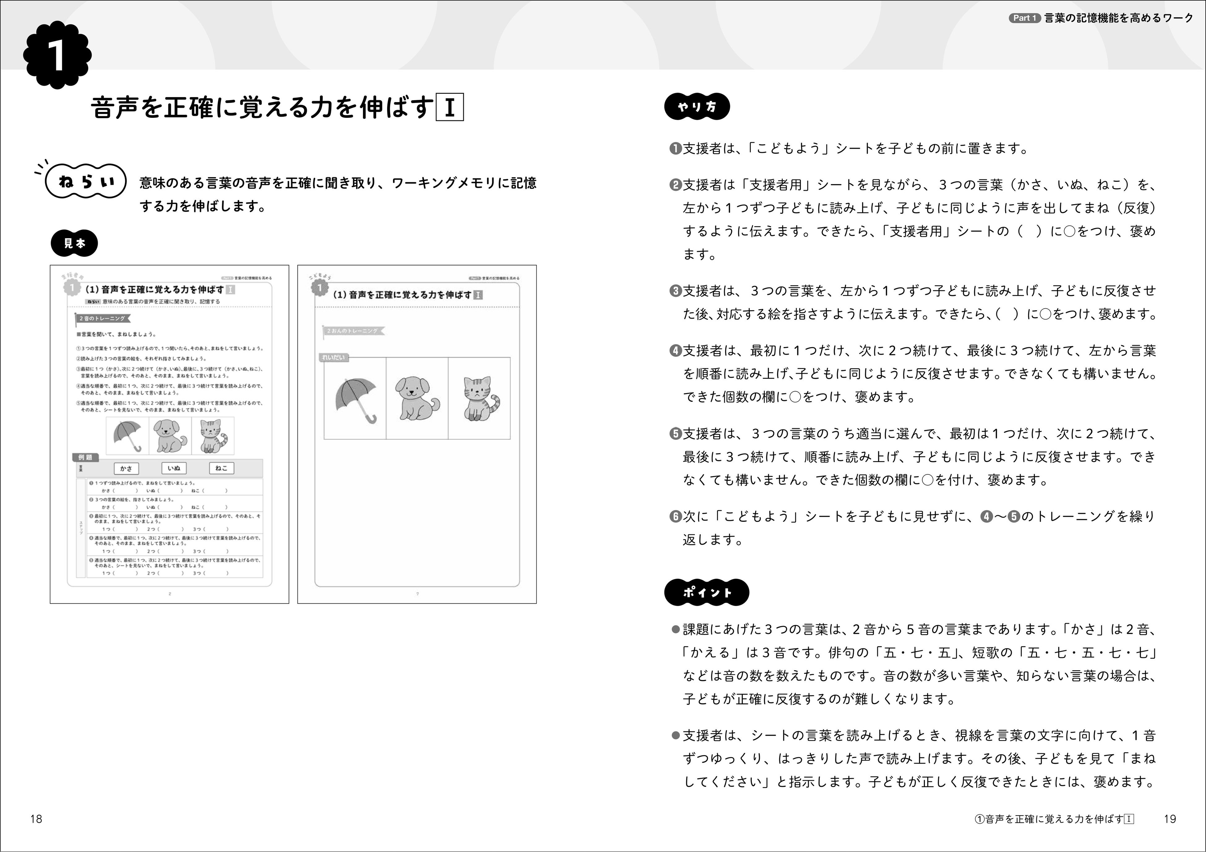 「Part1. 言葉の記憶機能を高めるワーク」には、「音声を正確に覚える力」「文を読む力」など言葉の音声情報の知識獲得をうながすトレーニングを掲載。