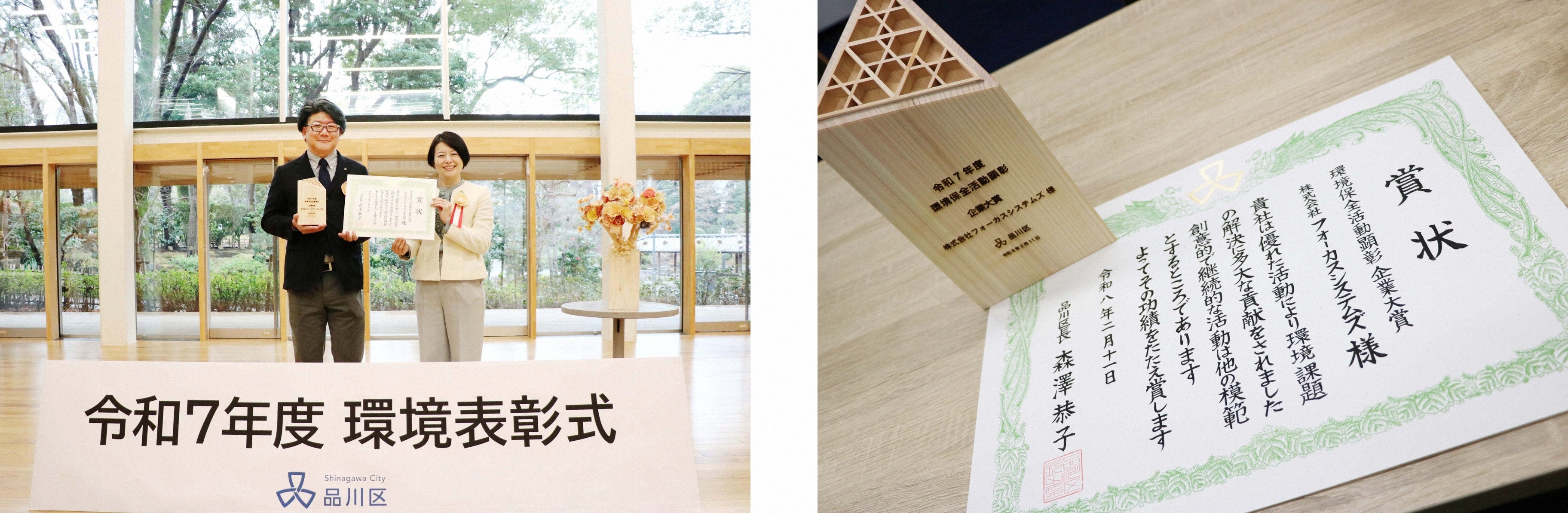株式会社フォーカスシステムズ(東京都品川区、代表取締役社長:森啓一、以下「当社」)は、本社を置く品川区が主催する「令和7年度環境保全活動顕彰」において、最高位となる「企業大賞」を受賞しました。