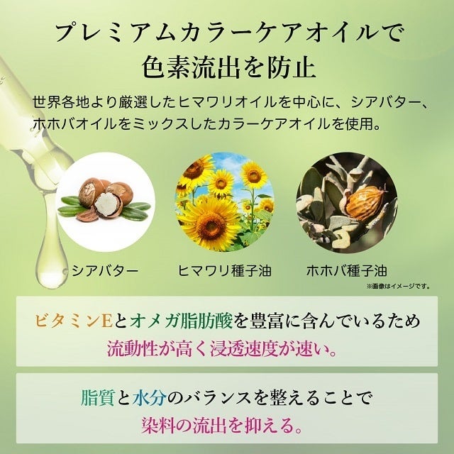 シルクと2架橋型シルクポリマー(保湿成分)で毛髪表面を補修し髪の毛にツヤを出し、カラーやケラーシャンプーによって発色した髪色を、よりきれいに引き立たせるトリートメントです。