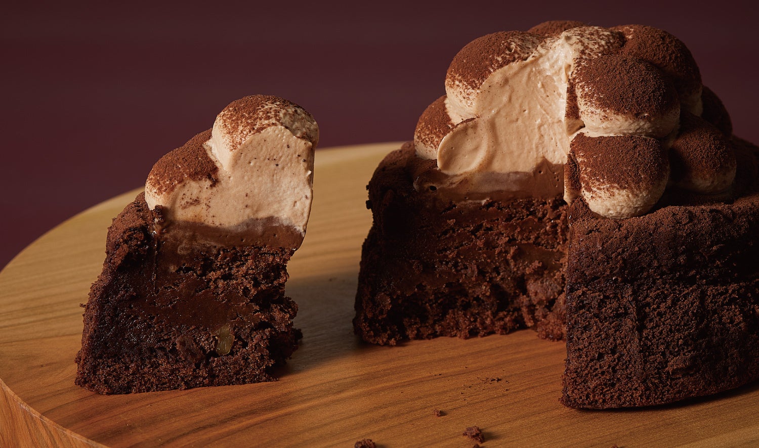 土台のガトーショコラはダークチョコレートとミルクチョコレートをブレンドし、隠し味に北海道産のクリームチーズを入れしっとり、濃厚な味わいに仕上げ、アクセントにローストしたくるみを入れています。