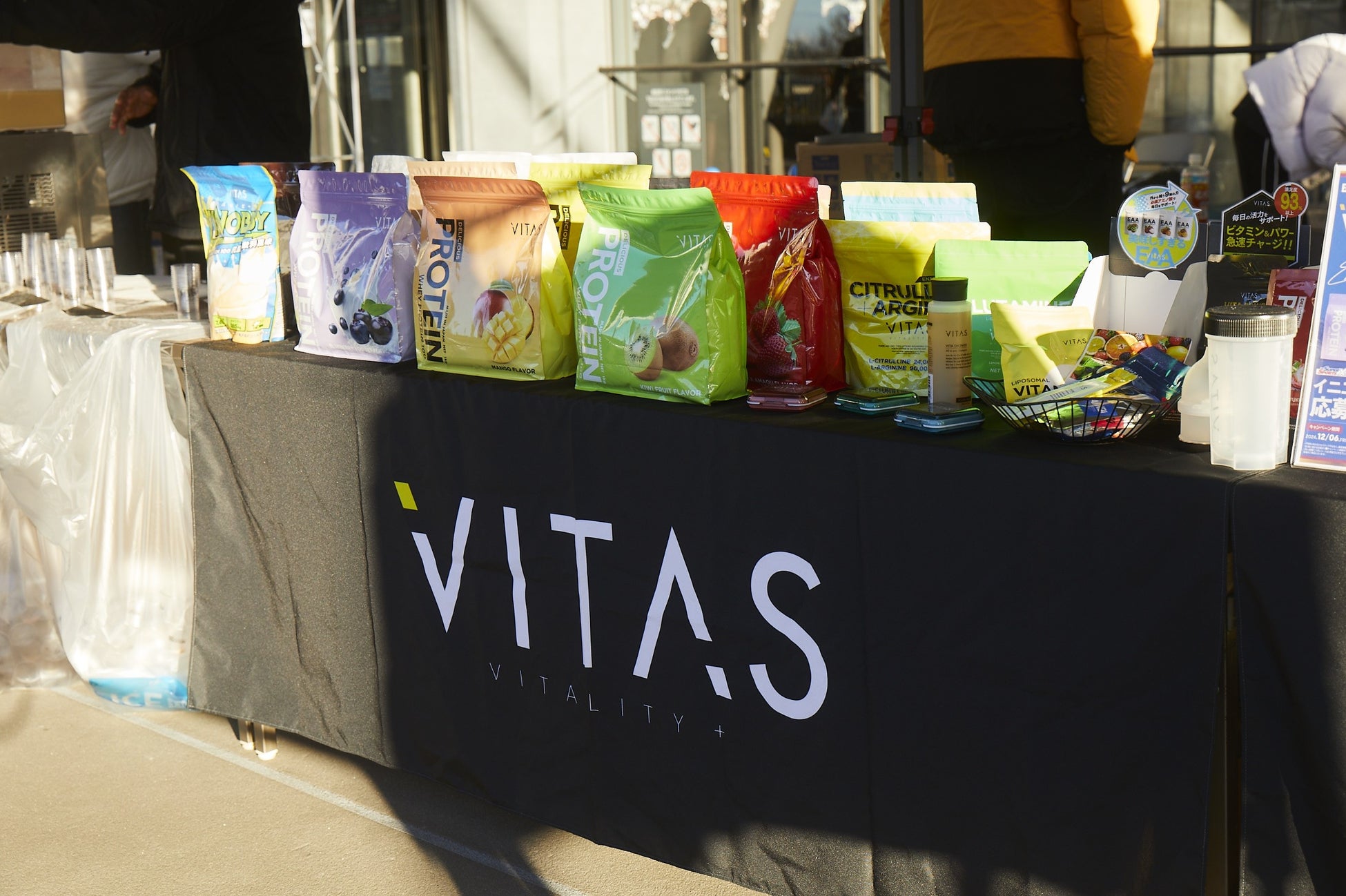 当日、VITAS は現地会場内に試飲&物販ブースを設置。試飲は、約1か月前に発売した子ども向け成長サポート飲料「バイノビー」と、ブルーベリーヨーグルト風味のプロテインの2種を用意しました。