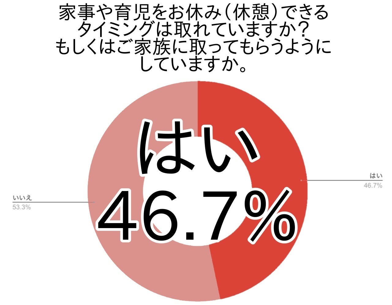 アンケートでは次に、主婦(主夫)の方が家事や育児のお休み(休憩)を取れているか、もしくはパートナーに取ってもらっているかについて尋ねてみました。
