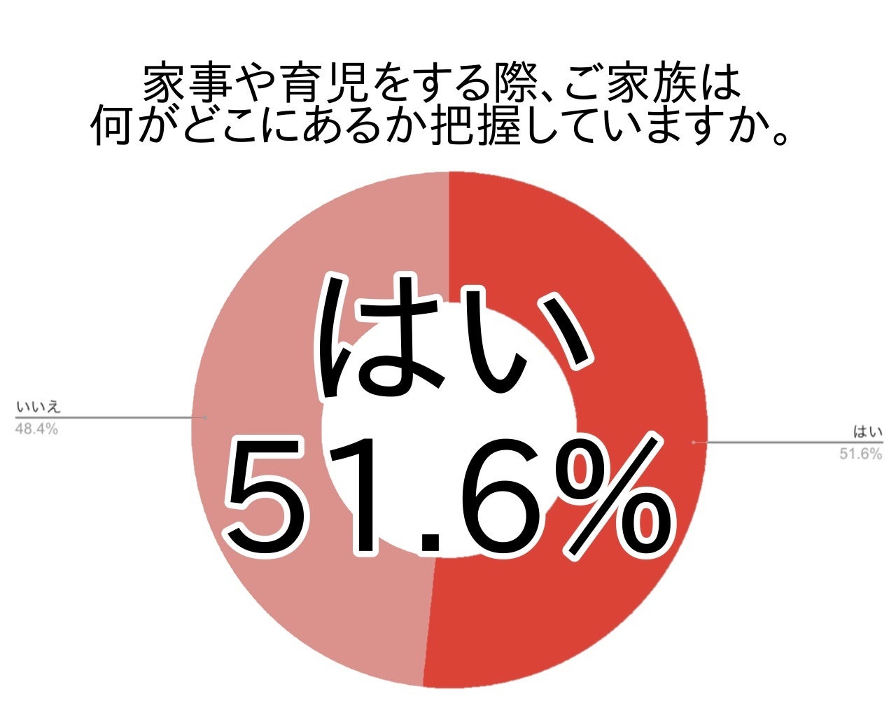 関東地域では家事や育児をする際に家族が何がどこにあるか把握していると答えた方は5割強(51.6%)でした。逆に約半数(48.4%)は把握できていないことがわかりました。