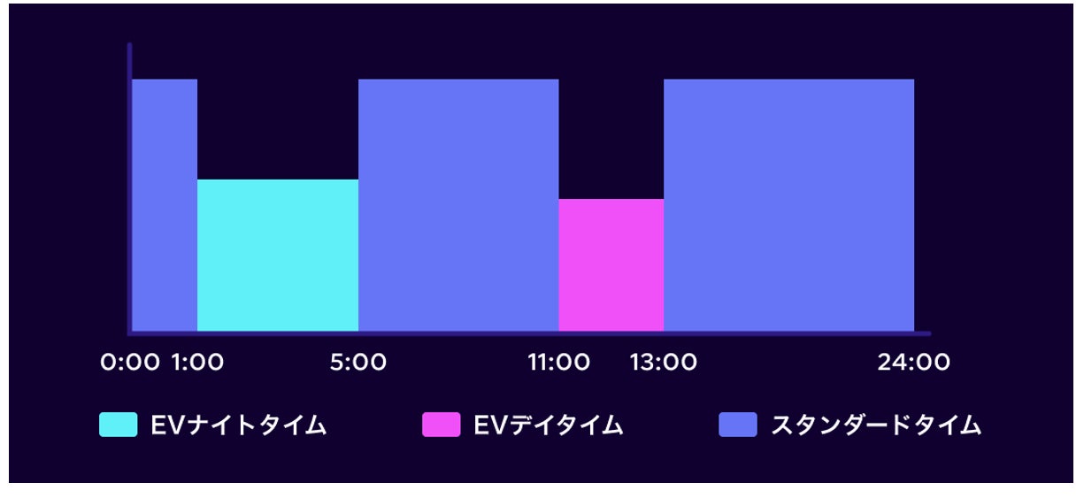 このたび提携する再生可能エネルギー100%の「EVオクトパス」は、日中と深夜の2つの時間帯で電気料金が安価になる特徴的な料金体系を持ち、オフピーク充電***との親和性も高いことから、EVユーザーの皆様にとってより柔軟で経済的な選択肢となることが期待されます。