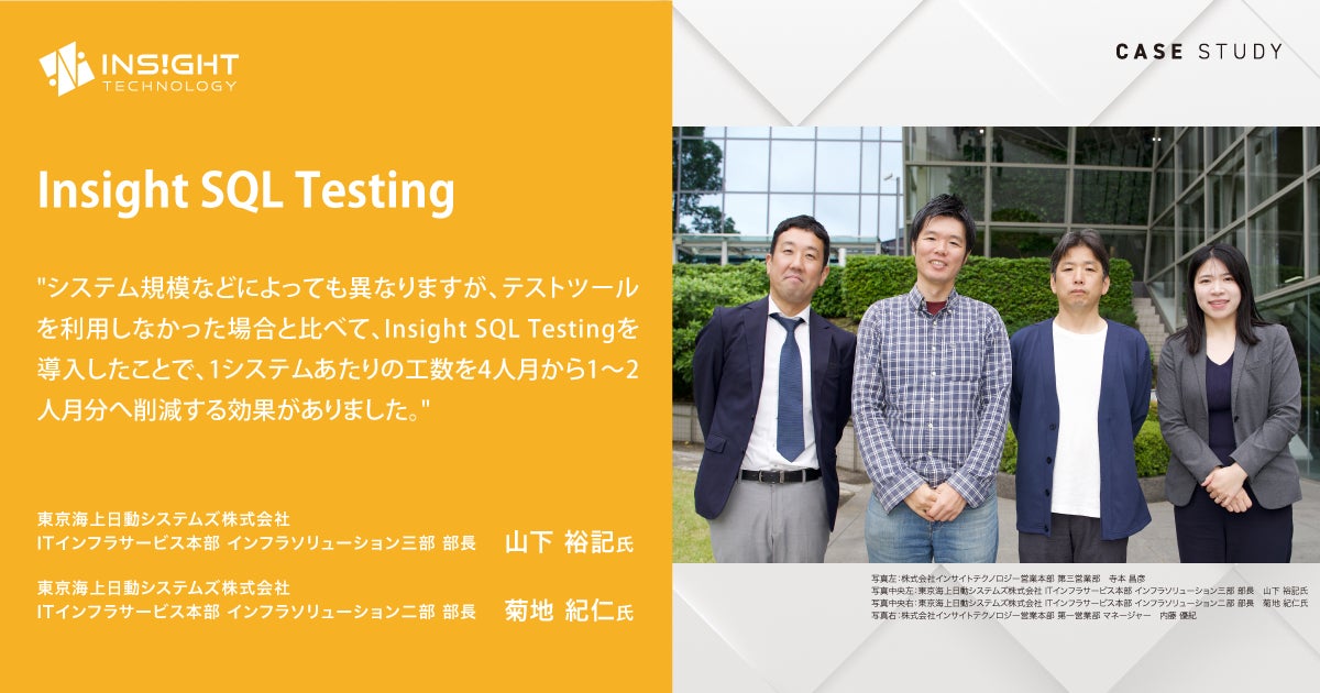 株式会社インサイトテクノロジー(本社所在地:東京都渋谷区、代表取締役社長 CEO:森田 俊哉、以下:インサイトテクノロジー)は、Amazon Aurora PostgreSQLのバージョンアップ対策として、東京海上日動システムズ株式会社(本社:東京都多摩市、代表取締役社長:原田 晋、以下:東京海上日動システムズ)がSQLテストソフトウェア「Insight SQL Testing」を採用したことをお知らせします。