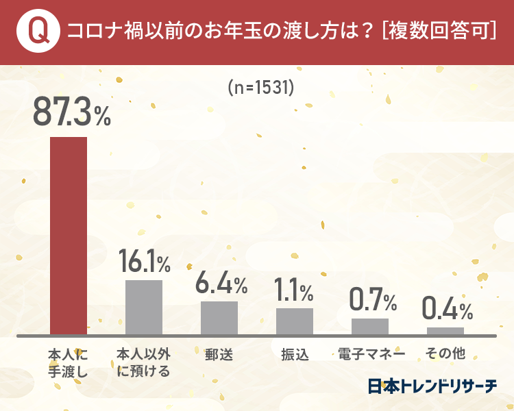 お年玉を渡したことがあると回答した1,531名に、コロナ禍以前のお年玉の渡し方を聞いてみました。