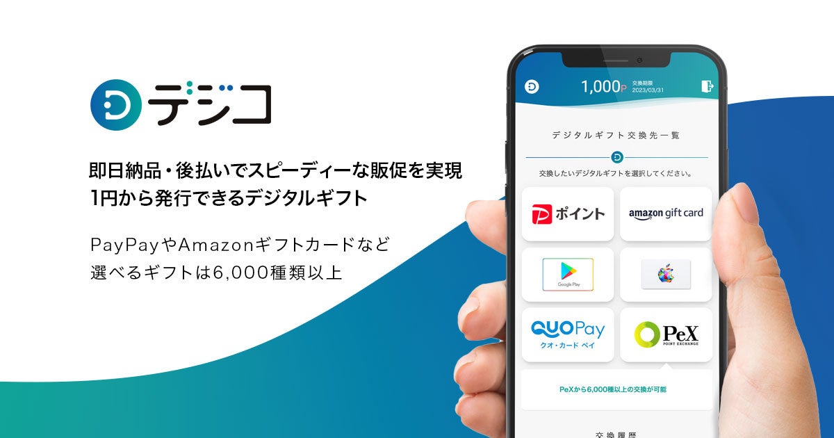 「デジコ」( https://digi-co.net/ )は、初期費用・月額費用無料で、PayPayやAmazonギフトカード、Apple Gift Card、Google Play ギフトコード、QUOカードPay、PeXポイントギフトなどに交換可能なデジタルギフトを、1円単位1枚から当日発行することができるサービスです。いつでもすぐに必要な分だけ発行することができるため、企業の広告予算の調整や急なキャンペーンの実施などにも柔軟に対応することができ、当日まで人数把握が難しいイベントの謝礼などにも幅広く活用することが可能です。
