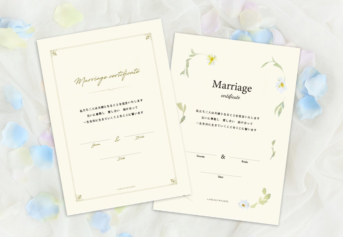 キャンペーン特典のひとつとして、らかんスタジオのオリジナル結婚証明書をご用意。撮影前に新郎新婦に署名いただくことで、結婚式さながらの気分を演出します。お二人で結婚証明書を手にした写真は、結婚式を挙げたような記念として残していただけるので、挙式予定のないカップルにも喜んでいただけるよう企画しました。できあがった結婚証明書は、ウェディングフォトと一緒に撮影することもでき、終了後は記念としてお渡しします。