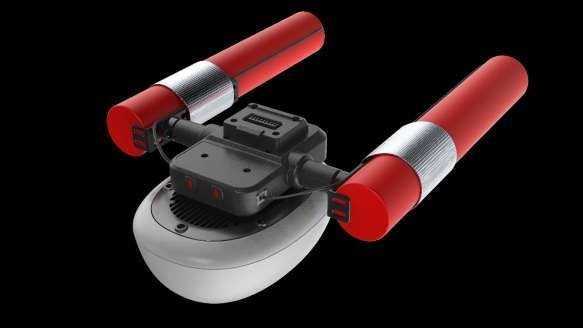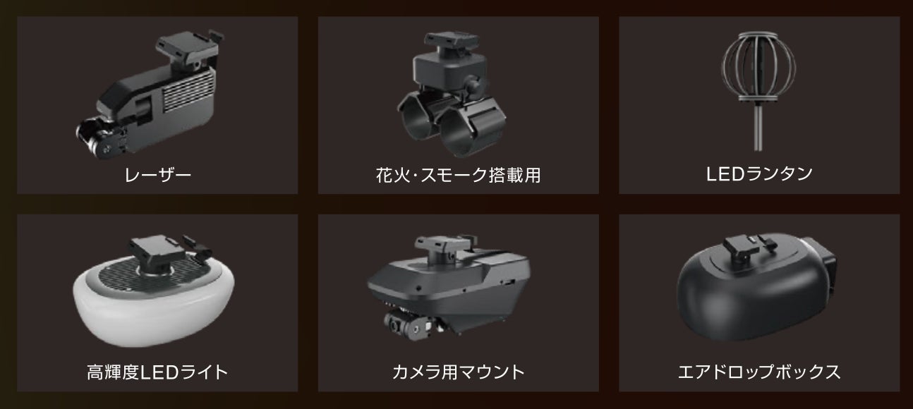 また、花火やスモーク、レーザー、LEDランタン、高輝度LEDライト、カメラ用マウント、エアドロップボックスなど多彩なモジュールを搭載できるため、アタッチメントの変更により演出の幅が大きく広がります(※3)。花火モジュールは2本同時に搭載可能で、角度が調節でき(0〜180度)、迫力あるパフォーマンスが可能です。