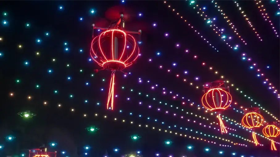 さらに、従来機と比較して1.5倍の明るさのLEDライトを搭載。従来機と互換性が良く、統合飛行が可能なシステムを構築しています。最新機と従来機を掛け合わせることで、それぞれの機体の強みを活かした光の抑揚や移動速度による緩急のあるドローンショーを構成することもできます。