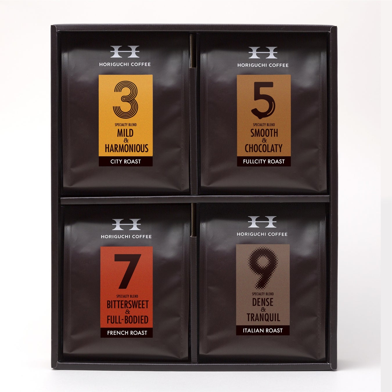 堀口珈琲の定番ブレンド「CLASSIC」シリーズを組み合わせたコーヒー豆のギフトです。ギフトの中身は香味の特徴別に4種類をご用意。
