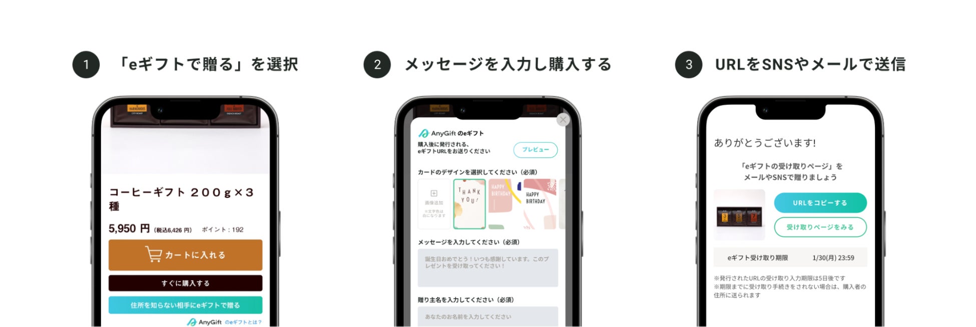 そこで、贈る側の方の負担を減らし、受け取る側の方もお好みのコーヒーを楽しみながら選んでいただきたいという想いから、受け取る側の方が好きな商品を自由に選択できる機能を備えた「AnyGift」の導入を決定いたしました。