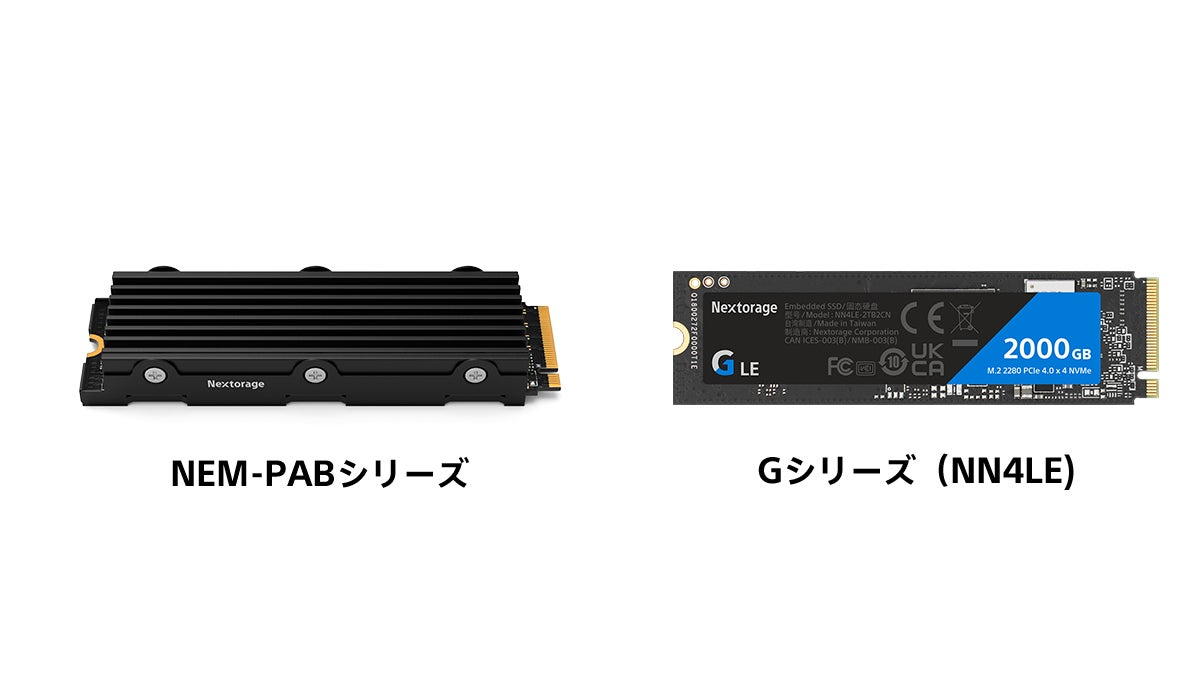 今回ご案内するNEM-PABシリーズとGシリーズLEはNextorageとして初となるDRAMレスを採用したゲーミングSSDです。DRAMレスの特性を活かし、省電力化と高速安定性を実現しており、読み出しが多い、ゲームの保存に適したSSDの新シリーズです。