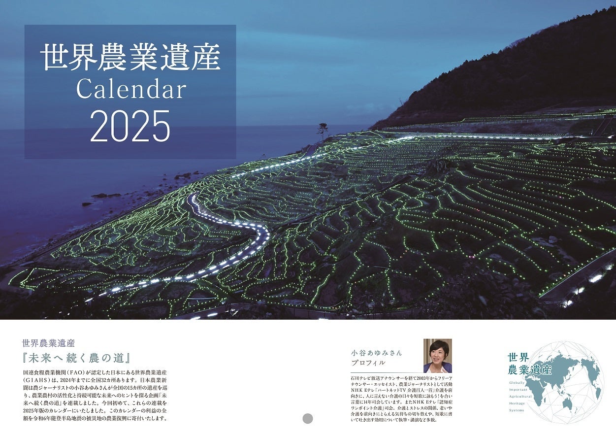 日本農業新聞(東京都台東区)は11月8日、国内にある15カ所の世界農業遺産(GIAHS)を取り上げた「世界農業遺産15ヵ月カレンダー(2025)」を発売します。農ジャーナリストの小谷あゆみさんと本紙カメラマンが取材した連載企画「未来へ続く 農の道」を再構成。26年3月まで使える、本紙オリジナルの壁掛け15カ月カレンダーとなっています。このカレンダーの利益の全額は、能登地域GIAHS推進協議会を通じて能登半島の地震・豪雨被災地の農業復興に寄付します。