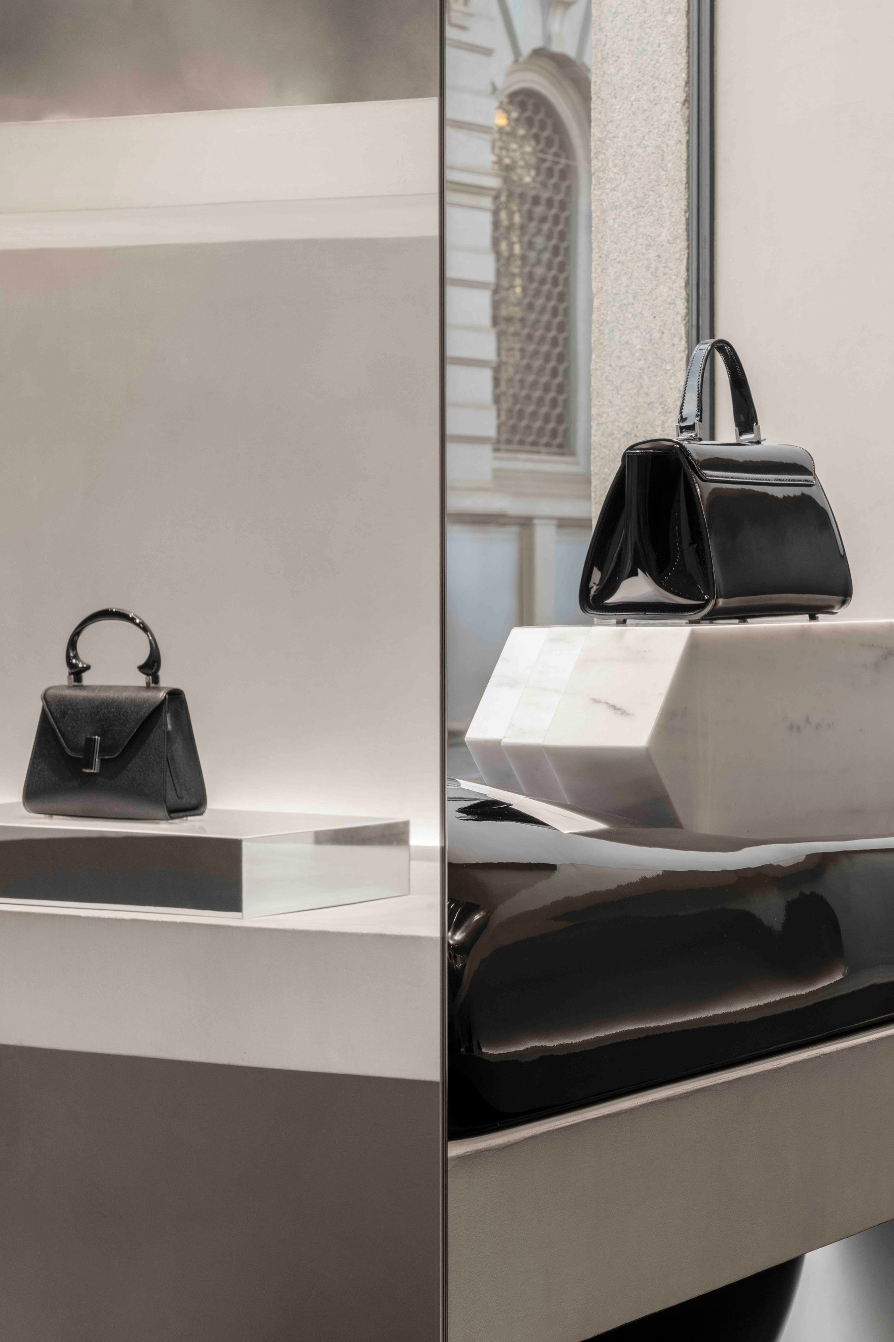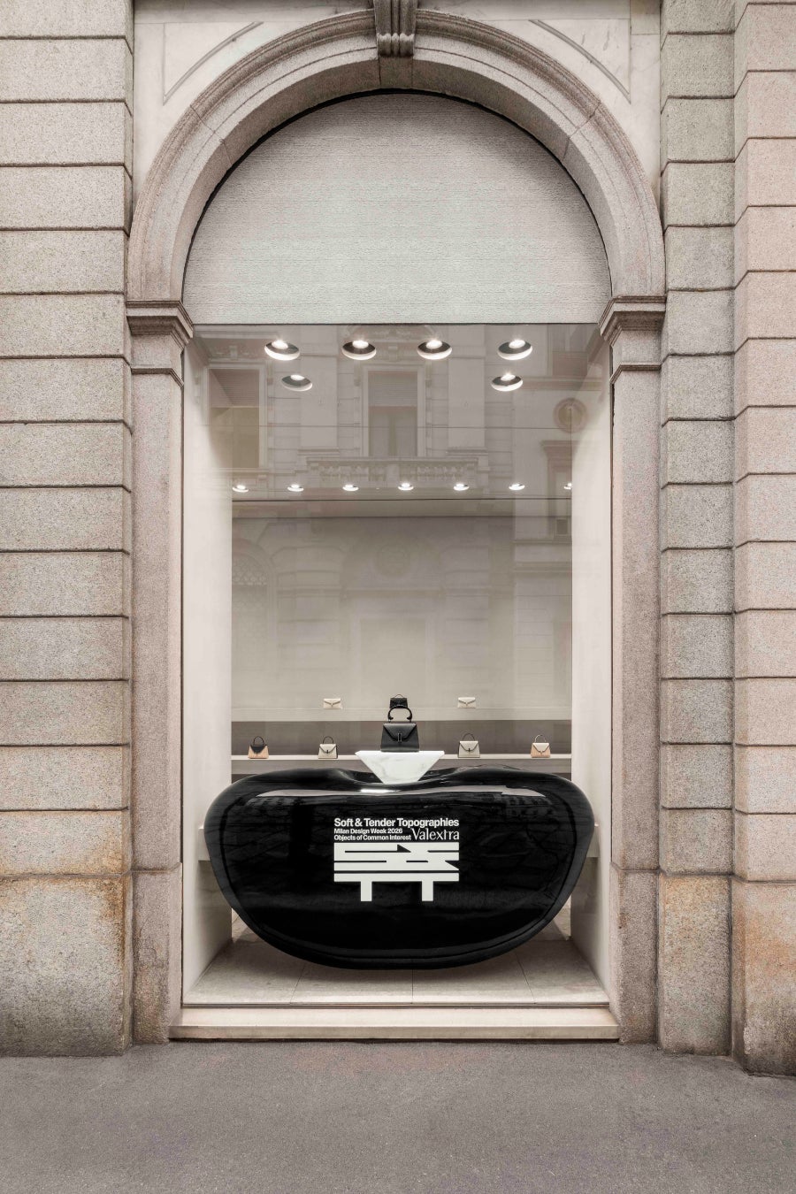 マンゾーニ通りの旗艦店内には、光沢を帯びた彫刻的なフォルムが点在します。高さやボリュームに繊細な変化を持たせたそれらの造形は、“島”のように静かに配置され、小さな大理石の台座を包み込みます。硬さとしなやかさ、構造と柔らかさという相反する要素の緊張感が、質量と表面の静かな対話を生み出しています。