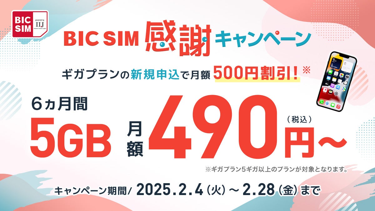 ビックカメラグループの格安SIMである「BIC SIM powered by IIJ(以下、BIC SIM)」は、新規でご契約したギガプランの月額料金を6ヵ月間500円割引、同時にお申込みいただいた通話定額オプションの月額料金を6ヵ月間400円割引する「BIC SIM 感謝キャンペーン」を実施します。