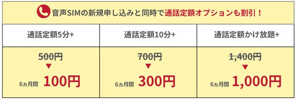 申し込み期間中に、ギガプランで新規契約または他社からの乗り換え(MNP)でお申し込みと同時に、通話定額オプションをお申込みいただくと、オプションの月額料金を6ヵ月間400円割引します。 |