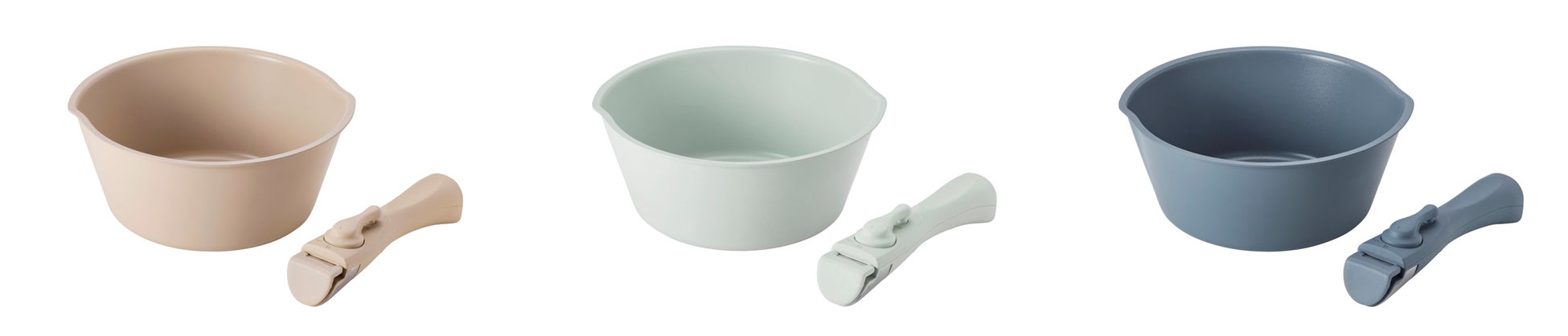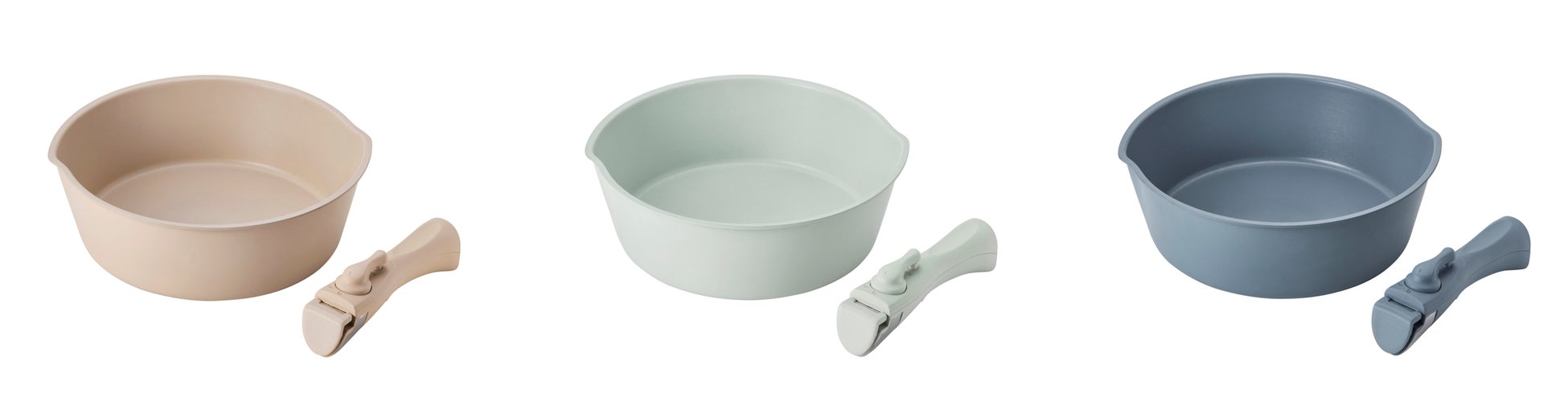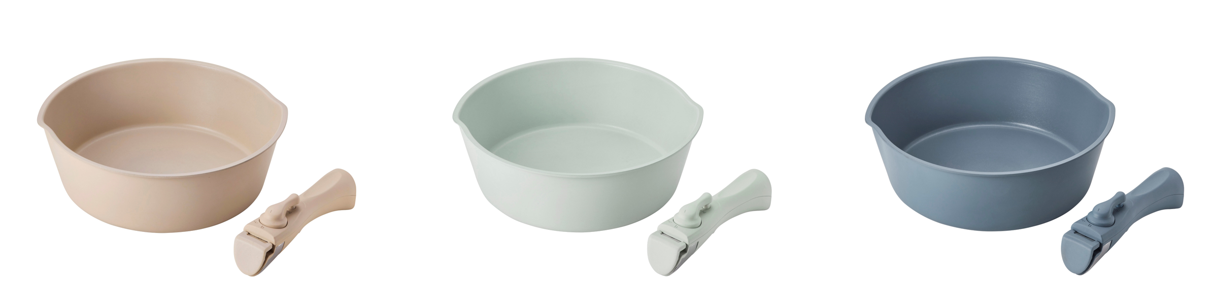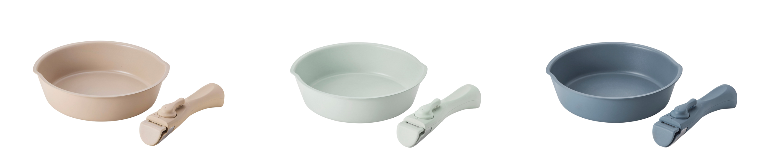 今回発売となる「フライパン6点セット」は、実用性とデザイン性を兼ね備えたフライパンとして開発しました。取っ手部分を外すことでお皿として使用でき、フライパンと鍋を重ねることでコンパクトに収納することができます。またニュアンスカラーとマットな質感のデザインで、食卓へそのまま出しても映えるお皿のようなデザインが魅力です。