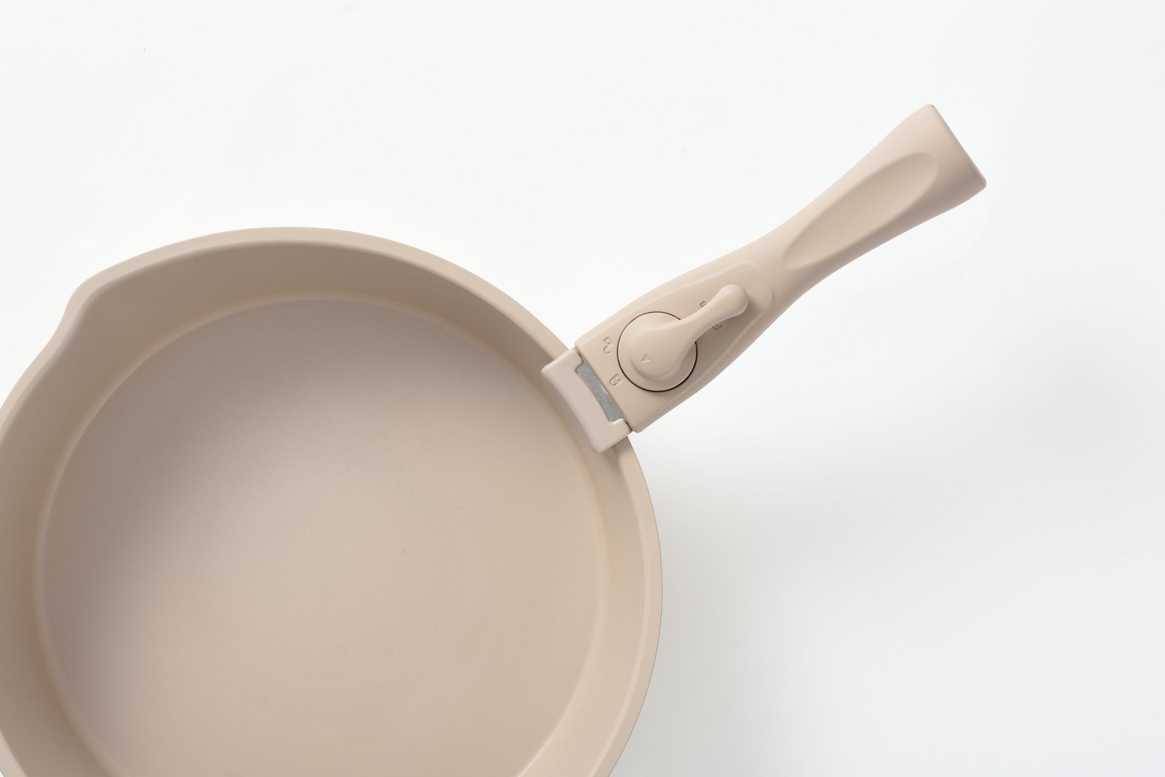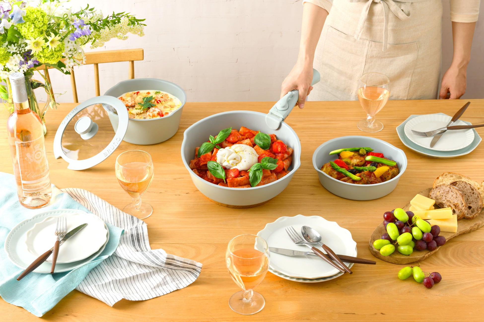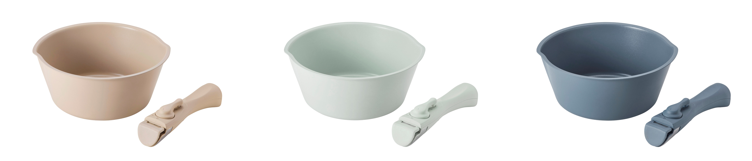 今回発売となる「フライパン6点セット」は、実用性とデザイン性を兼ね備えたフライパンとして開発しました。取っ手部分を外すことでお皿として使用でき、フライパンと鍋を重ねることでコンパクトに収納することができます。またニュアンスカラーとマットな質感のデザインで、食卓へそのまま出しても映えるお皿のようなデザインが魅力です。