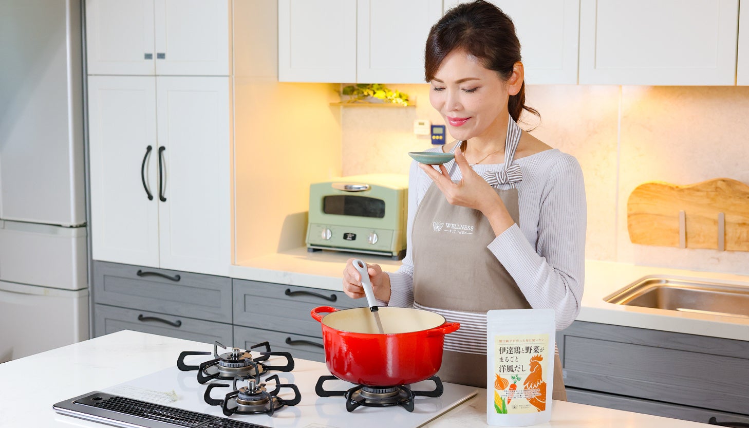 51歳で始めたYoutubeチャンネルが登録者60万人を突破し、直近1年では驚きの登録者12.8万人増加の急成長を遂げている「管理栄養士 関口絢子」。視聴者は65歳以上のシニア世代が半数以上を占め、次世代のウェルネスな食習慣をリードしています。シニア世代の健康を心掛ける人々にとって、知らない人はいない存在である関口絢子がプロデュースするブランド「ウェルネスキッチン」から、贅沢に11種類の国産素材を配合した<洋風だし>が新登場。主原料には、国産ブランド鶏「伊達鶏」のむね肉をそのまま粉末化して使用。さらにお出汁では珍しい「麹」と「八丁味噌」の発酵食品を配合することで、深いコクと旨みを生み出します。味の決め手は、3種類の野菜(にんじん・玉ねぎ・とうもろこし)と北海道産昆布。素材本来の自然な甘みとコク深い旨みが広がり、塩味を控えながらも満足感のある味わいに仕上げました。
