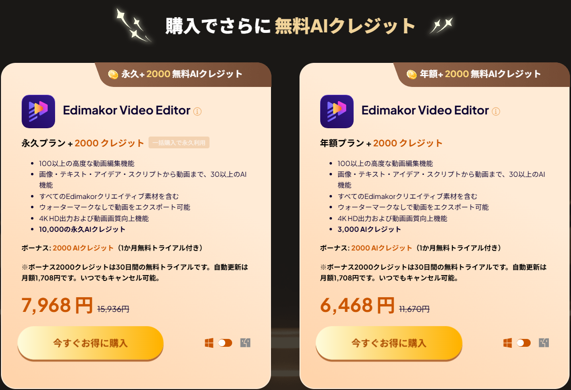 キャンペーン期間中にEdimakorの年間プランまたは永久プランを購入したユーザーには、2,000 AIクレジットが無料で付与されます。