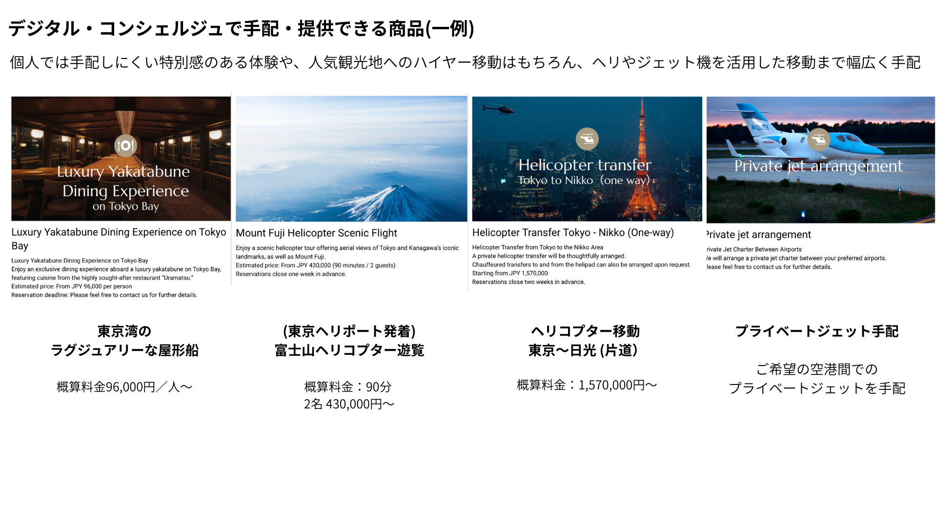 対応範囲:滞在前後のモビリティ(ヘリコプター、新幹線、ハイヤー)やアクティビティの手配