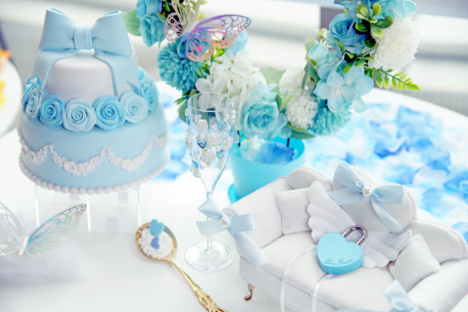 ぬいぐるみやアクリルスタンド、トレーディングカードを置いて写真撮影が可能。天使の羽をぬいぐるみに着けて撮影するのがおすすめです。